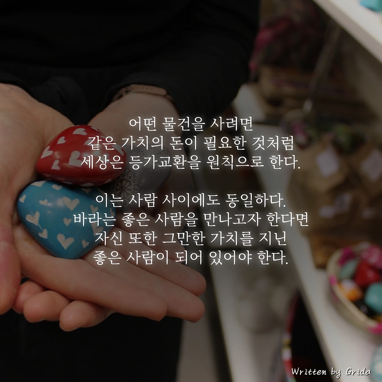 가게에서 물건을 사거나 중고 물품을 교환할 때 우리는 동일한 가치의 돈이나, 물건을 서로 주고받는다. 이런 행위를 흔히 등가교환이라고 하는데 이 원칙은 사람과 사람 사이에도 동일하게 적용이 된다. 비싼 물건을 헐값에 팔려는 사람은 없듯이, 자신이 바라는 좋은 사람을 만나고자 한다면 자신 또한 그런 사람과 어울릴만한 좋은 사람이 되어 있어야 한다.