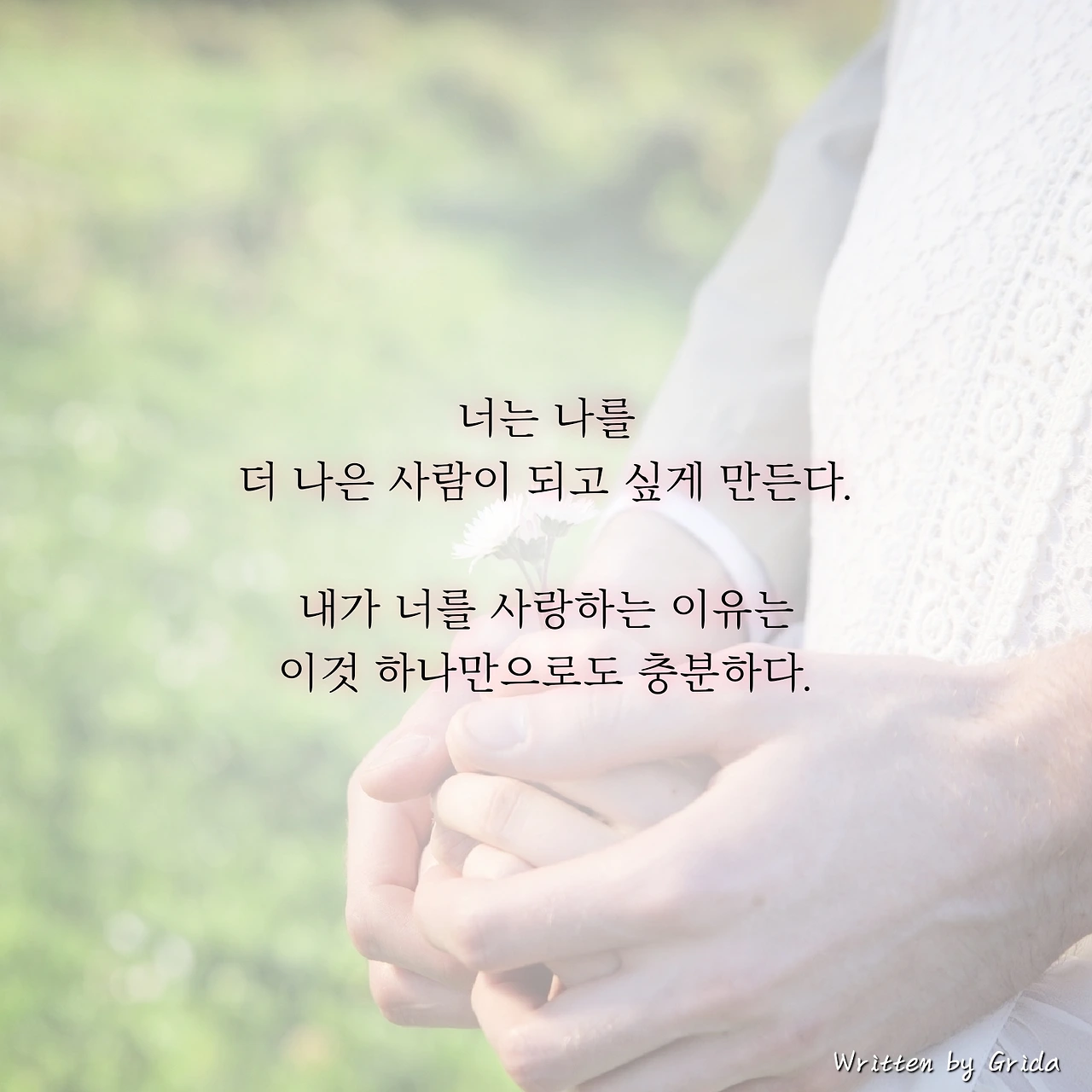 항상 고맙다는 말로, 말없이 내 손을 꼭 잡아주는 행동으로, 너는 나를 더 나은 사람이 되고 싶게 만든다. 내가 너를 사랑하는 이유는 셀 수 없을 만큼 많지만 사실 이것 하나만으로도 너를 사랑하기에는 충분하다.
