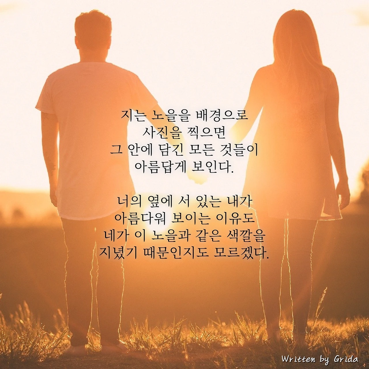 잠시 이런저런 감상에 젖다가 문득 너와 함께 남긴 다른 사진들을 떠올려보는 나. 사진마다 다른 느낌으로 기록된 우리의 모습이 참 아름답게 느껴진다. 그리곤 이내 생각한다. 네 옆에 서 있는 내가 아름답게 보이는 이유는, 아마 너 또한 이 노을과 같은 아름다움을 지녔기 때문일지도 모른다고 말이다.