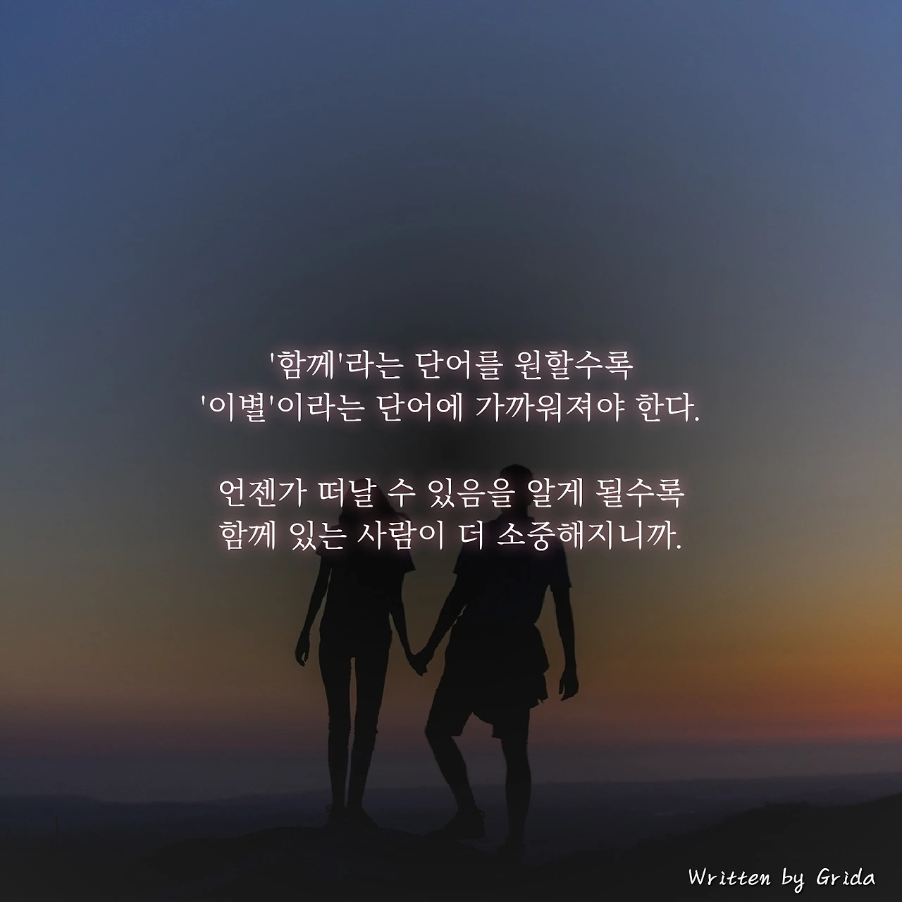 소중한 사람과 행복한 시간을 지속해나가고 싶다면 '함께'라는 단어와 함께 '이별'이라는 단어 또한 소중히 여길 줄 알아야 한다. 나와 함께 있는 사람이 언젠가 떠날 수도 있다는 사실을 상기하게 될수록 우리는 서로의 시간과 존재를 더 소중히 여기게 된다.