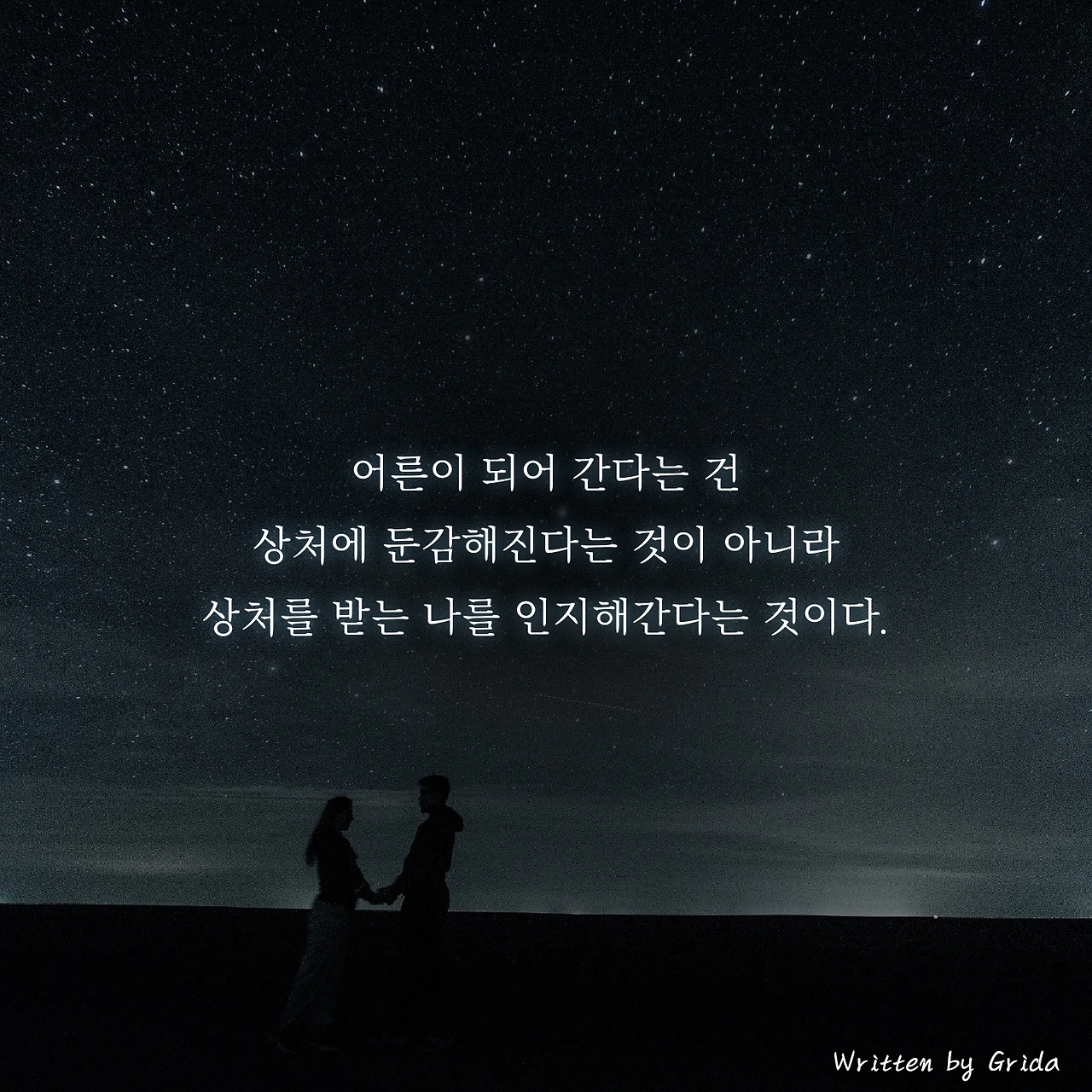 어른이 되어간다는 것은 무엇일까? 단순히 경험을 많이 하고많은 지식을 쌓고, 외부의 자극에 익숙해진다는 것을 의미하는 것은 아닐 것이다. 내가 떠올리는 '어른이 된다'라는 의미는 그동안 받은 상처들에 대해서 점점 둔감해진다는 것이 아니라, 자꾸 상처를 받는 나의 모습을 인지하고 그것을 수용해가는 과정이라고 생각한다.
