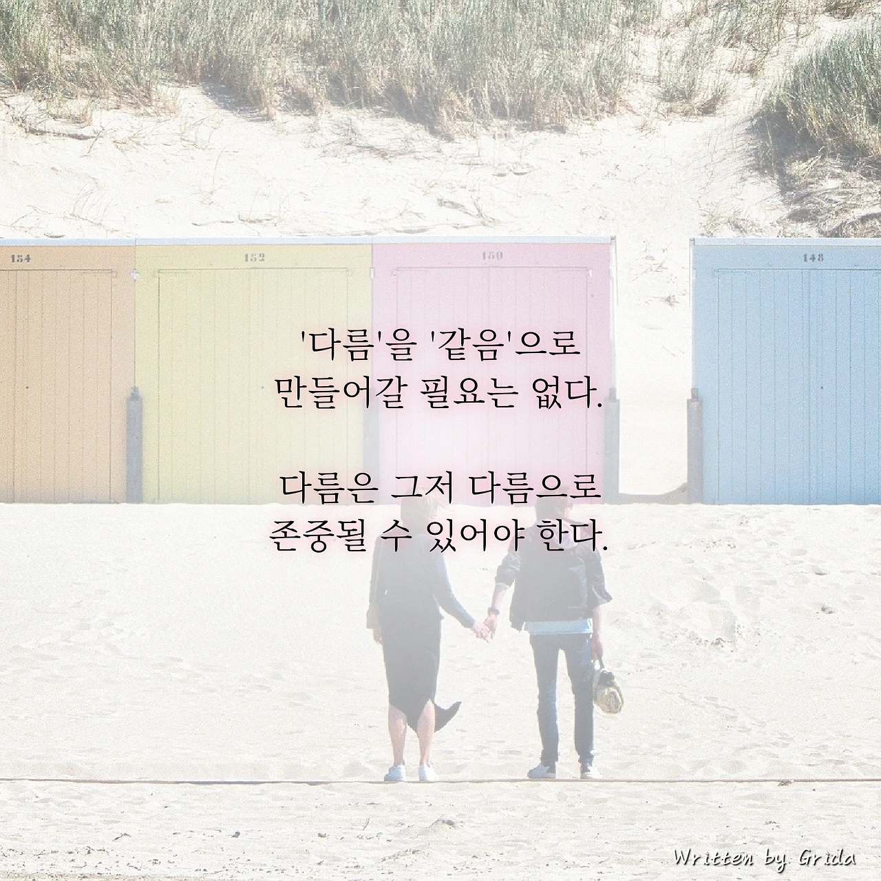 가까워지기 위해서. 혹은 더 많이 이해하기 위해서 서로의 '다름'을 '같음'으로 만들어갈 필요는 없다. 왜냐하면 모든 사람은 각자가 옳다고 생각한 '다른 삶'을 오랜 시간 동안 살아왔으니까 말이다. 오히려 우리는 서로의 다름을 그저 '다름'으로 존중하고 가만히 내버려 둘 수 있을 때, 상대방을 더 많이 이해할 수 있게 된다.