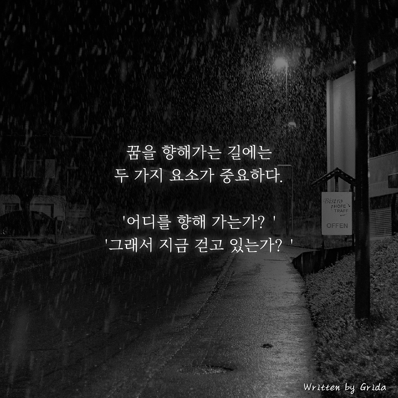 한 치 앞을 예상하기도 쉽지 않은 세상에서 꿈을 꾸기란 사치와 같을지도 모른다. 그러나 우리는 배고픔에 식사를 하게 되는 것처럼 가슴속에 내재된 '꿈에 대한 욕망'을 자연스레 쫓게 되어있다. 나는 생각한다. 꿈을 향해가는 길에 무엇이 중요하겠느냐고. 곰곰이 생각해 보니 두 가지 정도로 압축이 되었다. 그건 바로 '어디를 향해 가는지'와 '그래서 지금 걷고 있는지'에 대한 물음이 그것이다.