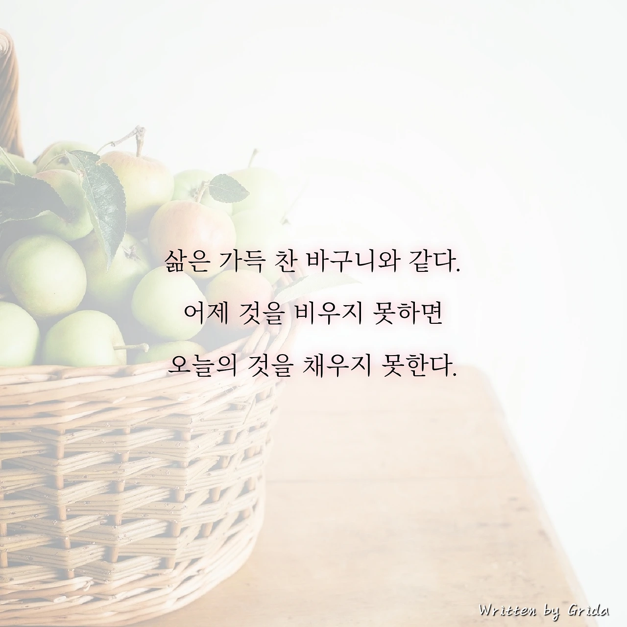 물건으로 가득 찬 바구니에 새로운 무언가를 담으려면 이전에 담아두었던 것들을 비워낼 필요가 있다. 우리의 삶도 이와 마찬가지다. 새로운 감정을 담으려면 어제 담아두었던 슬픔들을 깨끗이 비워낼 필요가 있다. 어제에 매여서 살면 오늘 찾아온 행복을 온전히 끌어안지 못한다.