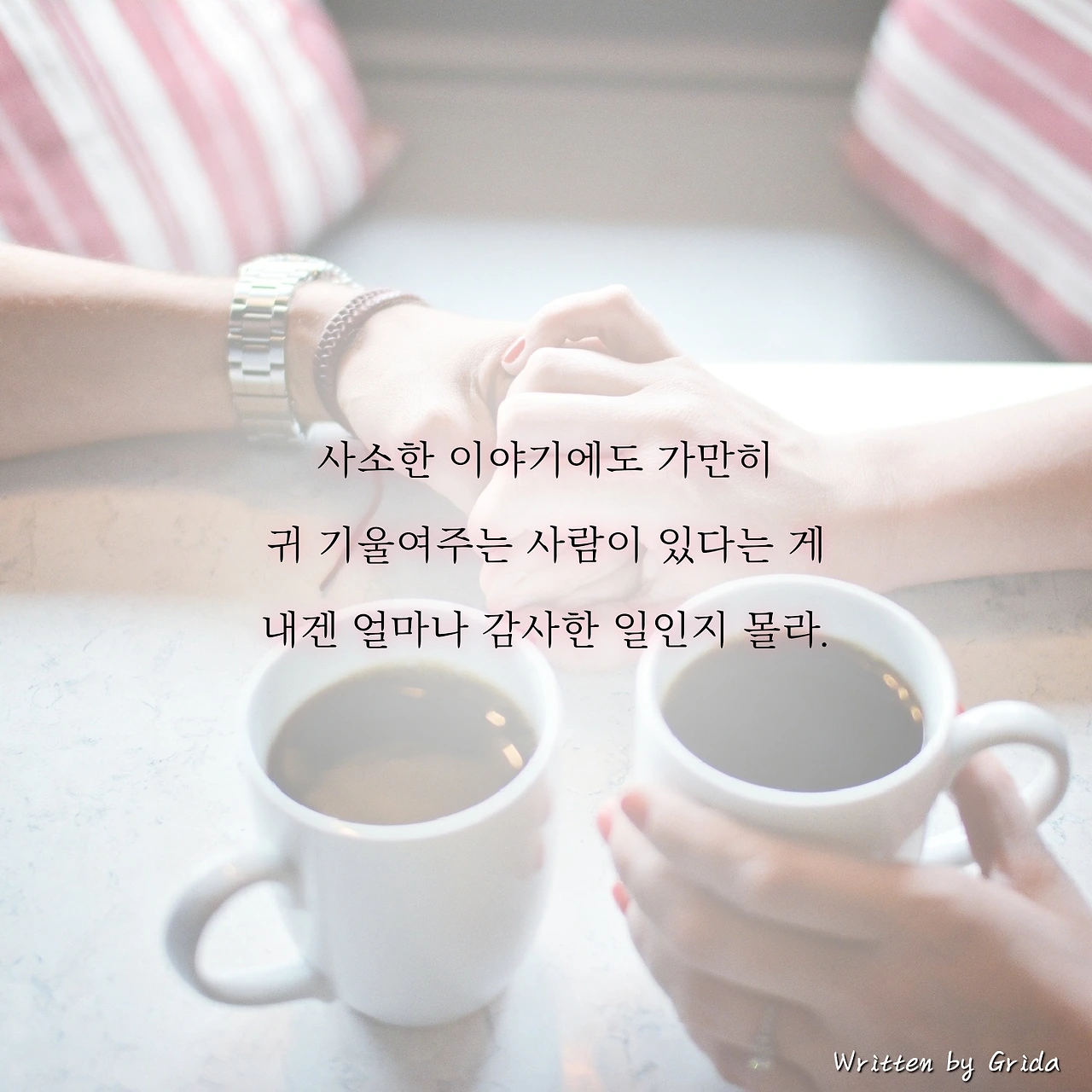 가끔 터져 나오는 투덜거림, 별것 아닌 사소한 이야기에도 무슨 일 있었냐며 궁금해하고 가만히 귀 기울여주는 사람이 있다는 게 내겐 얼마나 감사한 일인지 몰라. 이제는 일상이 되어버린 너의 존재가 나의 하루에 얼마나 큰 위안이 되는지 몰라.