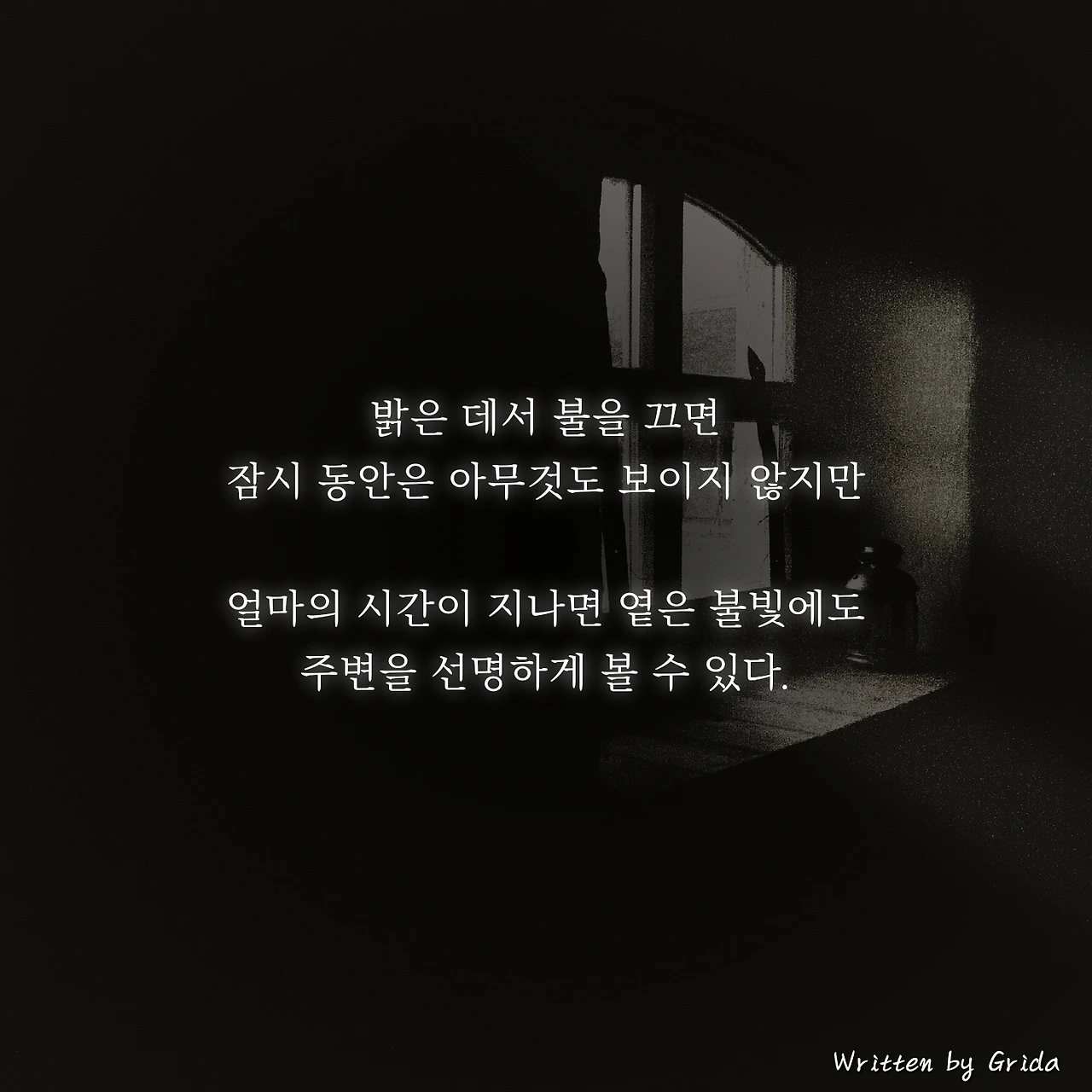밝기만 하던 방의 불을 끄면 밝음에 익숙해져 있던 몸과 마음이 어둠에 적응하지 못해 아무것도 보이지 않게 된다. 그러나 잠깐의 시간이 지나면 서서히 주변에 있는 것들의 실루엣이 보이고, 얼마의 시간이 더 지나가면 옅은 불빛에도 주변을 선명하게 볼 수 있게 된다.