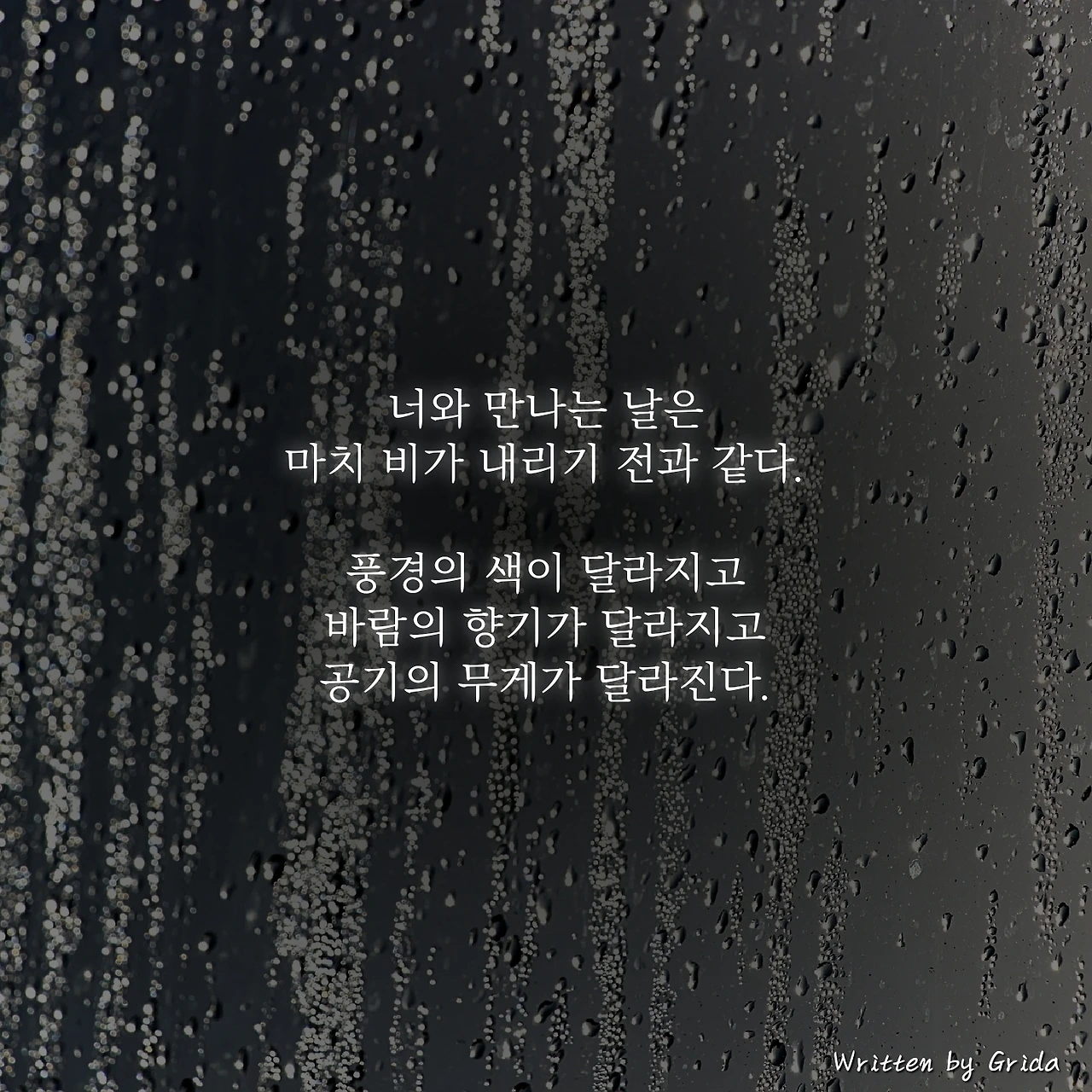 어제와는 달라진 하루를 만끽하다 보니 문득 네가 떠오른다. 너를 만나러 가던 날도 마치 오늘처럼 주변의 모든 것이 달라졌다. 풍경은 선명해졌고, 바람은 향기로웠으며 날아갈 듯 공기는 가벼웠다. 아주 잠깐 너를 생각했을 뿐이지만 불어오는 바람이 한결 가벼워진다. 오늘은 내가 좋아하는 비와 너를 마음에 담을 수 있어 참 좋은 날이다.