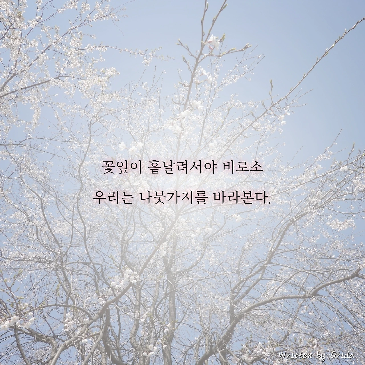평소에도 얼마든지 고개를 들어 꽃을 볼 수 있음에도 우리는 꽃잎이 흩날려서야 비로소 나뭇가지를 바라본다. 오늘은 잊었던 '늦음'에 대해서 다시금 반성하게 되는 날. 너무나도 늦었다는 것을 상기시켜주려는 듯 바람은 더 세차게 꽃잎을 떨어트리고 있다.