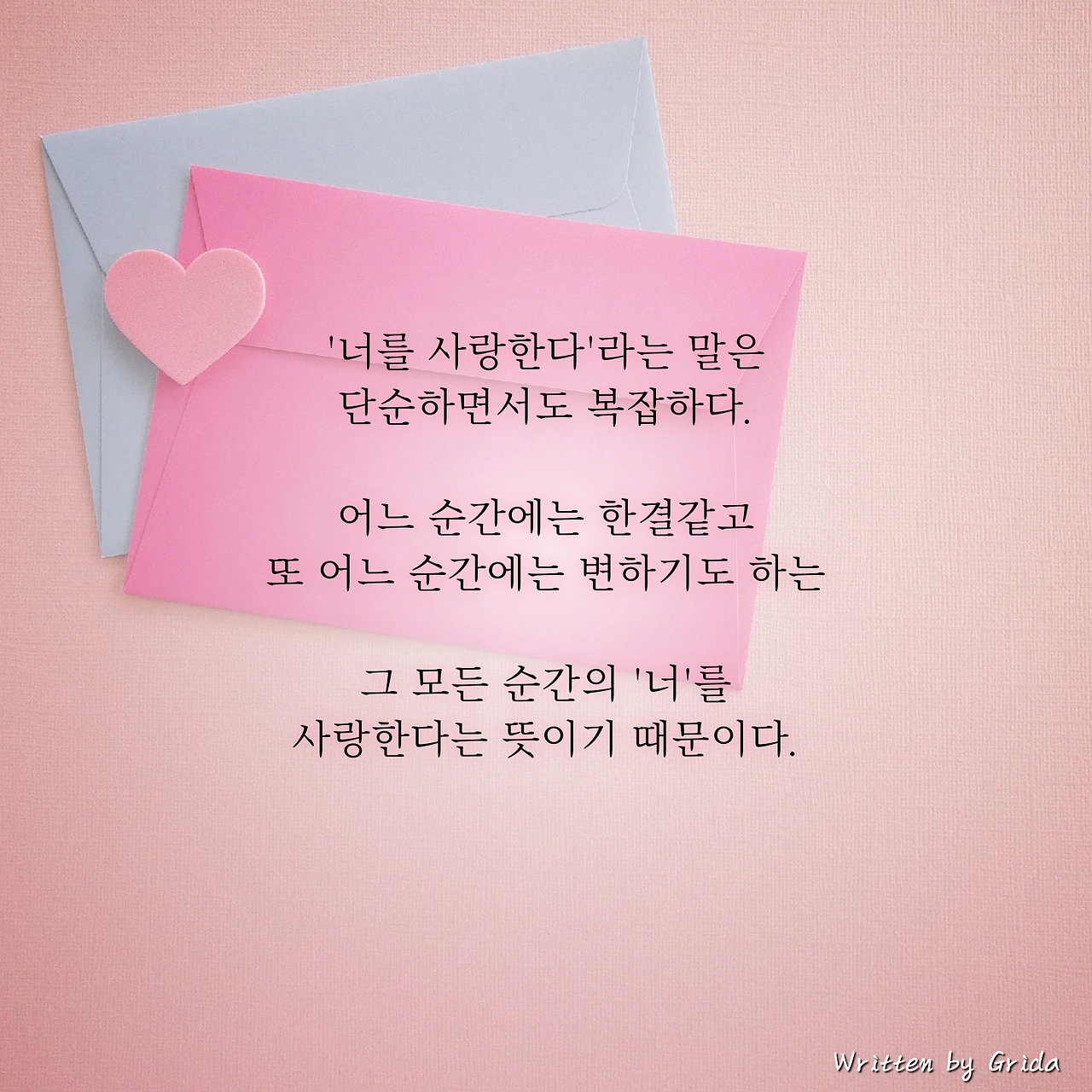 '너를 사랑한다.'라는 말은 상대방에게 건네는 말이지만 스스로도 다짐이 필요한 말이다. 이 말속에 담긴 '너'라는 주체는 바위처럼 오래도록 한결같을 때도 있고, 때로는 구름처럼 제멋대로 변하기도 하기 때문이다. 모든 순간의 '너'가 아니라 나의 틀에 맞는 너만 사랑한다는 것은 반쪽짜리 사랑을 하겠다는 말과 다름이 없다. 내가 끌리는 부분을 가진 너의 모습과 그렇지 않은 너의 모습까지 모두 보듬을 수 있어야 보다 성숙한 사랑이 시작되는 것이기 때문이다.