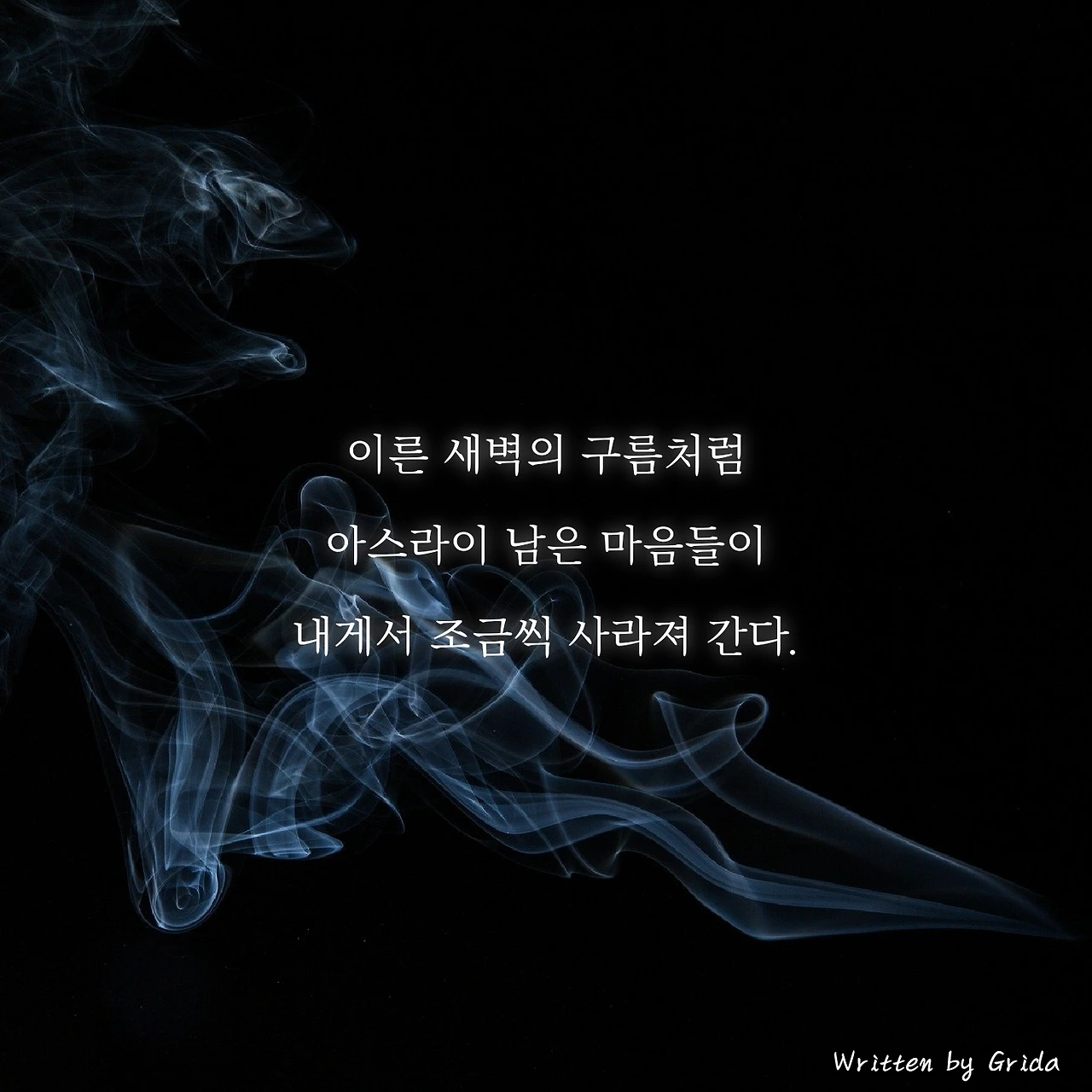 이런 느낌을 통해서 내가 깨달은 것은 시선에서 멀어진 것들은 결국 잊히게 된다는 사실이다. 오늘도 나는 소중한 것을 붙잡으려 애를 쓰고 있지만 이른 새벽의 구름처럼 아스라이 남은 마음들이 내게서 조금씩 사라져가고 있음을 느낀다.