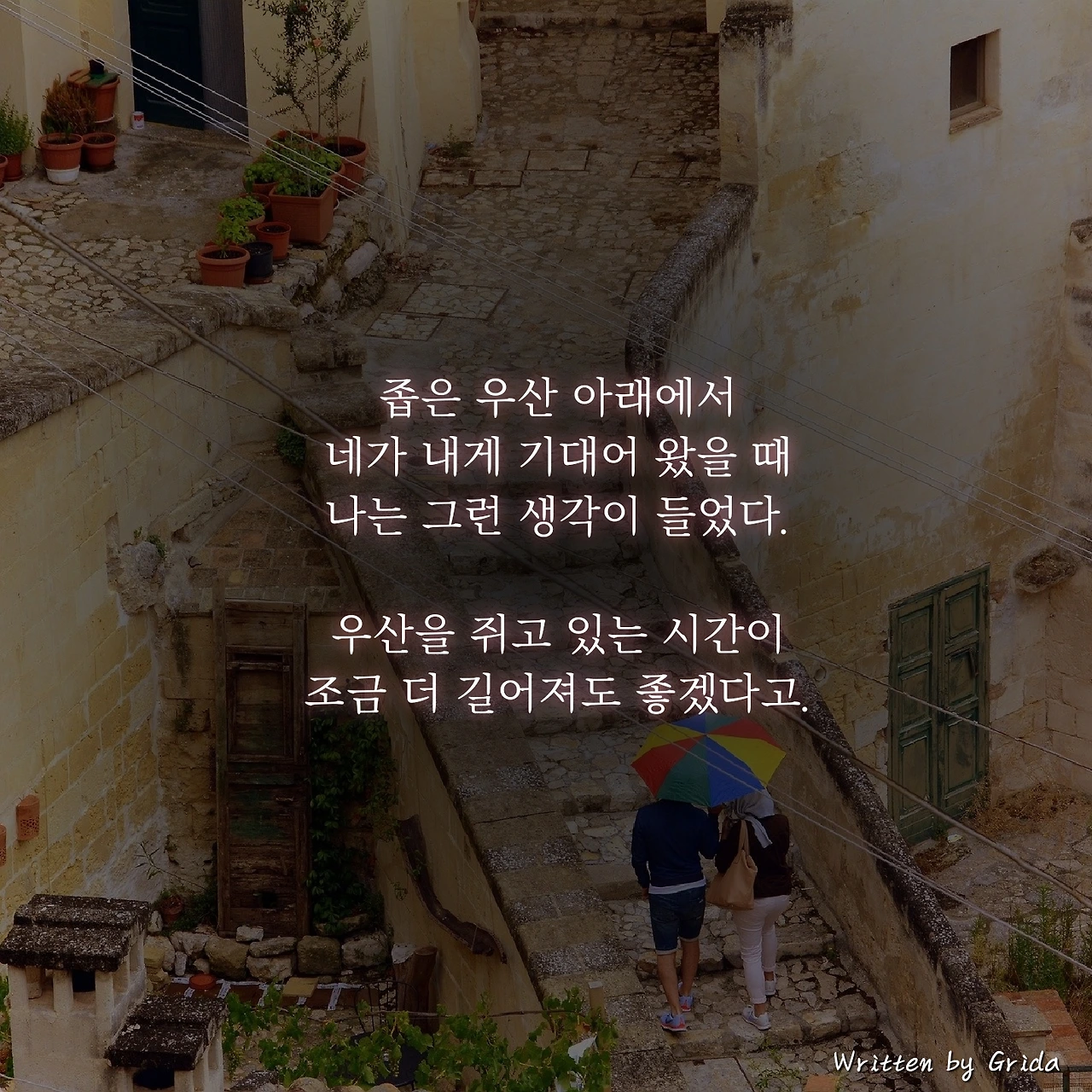 자동차들이 괴성을 지르는 도로를 지나 한적한 골목에 들어섰을 무렵, 하늘에서는 갑자기 비가 쏟아져 내렸다. 땅에 있는 모든 것을 잠기게 할 듯이 매섭게 하강하는 빗방울에 너 나 할 것 없이 정수리를 가리고 뛰어다니는 사람들. 나는 혹시나 해서 챙긴 우산을 재빨리 펼쳤고 두 켤레의 신발은 좁은 우산 아래에서 나란히 모이게 되었다. 바닥에서 튄 빗방울이 신발과 바지 끝단을 적셨던 탓에 네가 기분 나빠하지 않을까 하는 생각이 들고 그런 불안감에 나의 두 눈이 목적을 잃은 채 이리저리 흔들리던 찰나, 너의 무게가 천천히 내 어깨에 실리는 것이 느껴졌다. 시끄럽게 울리던 빗소리는 그 순간 음소거 버튼을 누른 듯 조용해졌고 낯선 고요함만이 우산 아래를 가득 매우게 되었다. 우리는 서로 아무 말 없이 앞을 보고 걸었지만 나는 포근한 안개와 같은 무언가가 우리의 주변을 둘러쌓고 있다는 느낌을 받았다. 그리고 방금 전 생긴 불안함을 기만이라도 하려는 듯이 이런 생각을 하게 되었다. 내가 우산을 쥐고 있는 시간이 조금 더 길어져도 좋겠다고.