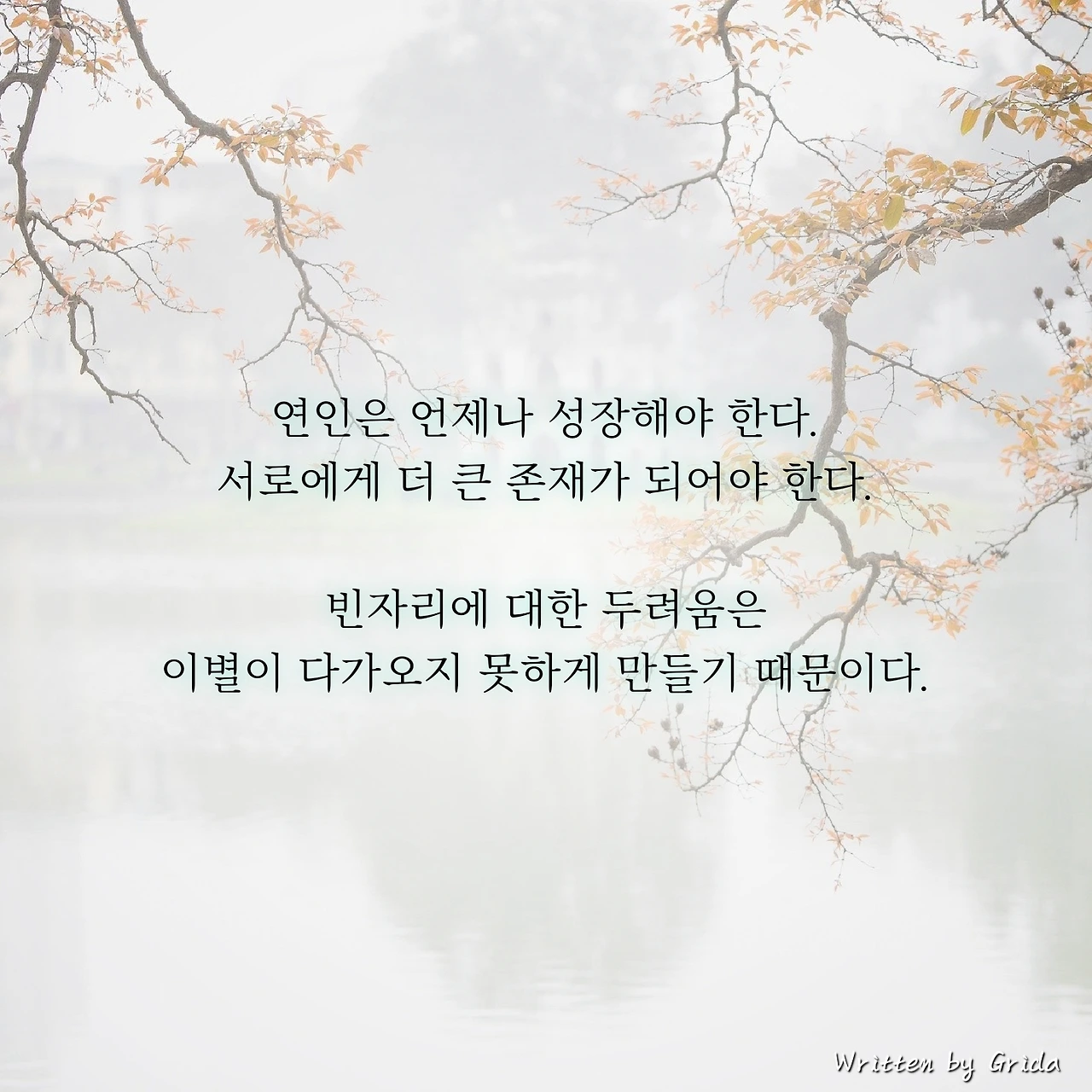 나는 수많은 이별들을 지켜보며 생각했다. 이별은 새로운 사랑에 대한 갈망보다는 빈자리가 생겨도 그리 두렵지 않다는 마음에서 비롯된다는 것을. 그래서 우리는 더 나은 사람이 되어야 하고 서로의 마음에 많은 부분을 채울 수 있는 사람으로 거듭나야 한다. 서로가 서로에게 가벼운 존재가 되는 순간, 이별은 기다렸다는 듯이 고개를 들게 될 테니까.