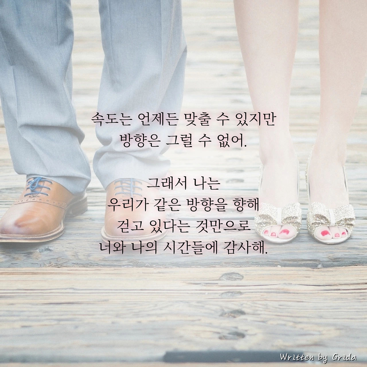 우리는 색다른 무언가를 찾아 그것에 감사하려 하지만 나는 우리가 함께 걷고 있다는 이 사소한 행동에도 감사할 일이 있다고 생각해. 속도는 서로의 발을 보며 천천히 맞추어갈 수 있지만, 방향은 하나의 가치관과 같아서 바꾼다거나 맞추는 것이 어렵거든. 그래서 나는 지금 우리가 같은 방향을 바라보고, 또 함께 걸을 수 있다는 것만으로도 충분히 너와 나의 시간들에 감사하게 돼.