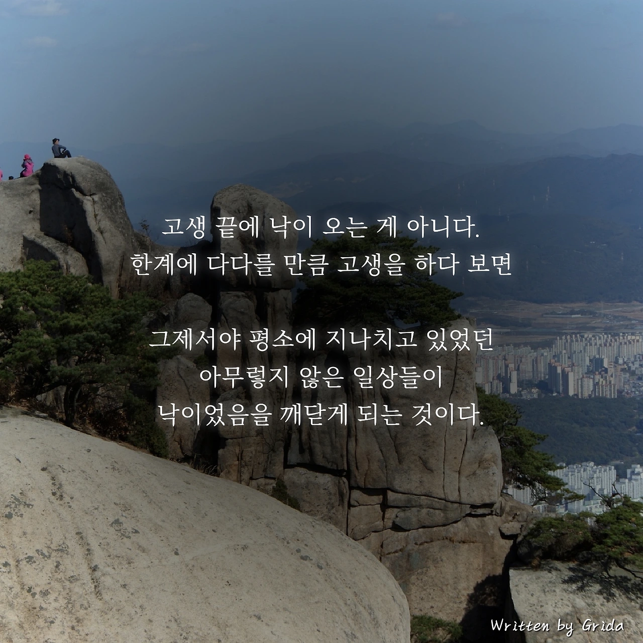 흘린 땀을 식히며 가까운 돌 위에 앉아 산 아래의 풍경을 감상하고 있으니, 나는 문득 어떤 생각이 떠올랐다. '고생 끝에 낙이 온다.'라는 말은 어쩌면 다르게 해석해야 할지도 모르겠다고. 낙(행복)이란 저절로 주어지는 게 아니라 한계에 다다를 만큼 고생을 하다보면 그제서야 평소에 지나치고 있었던 평범한 일상들이 낙이었음을 깨닫게 되는 것이 아닐까 하고 말이다.
