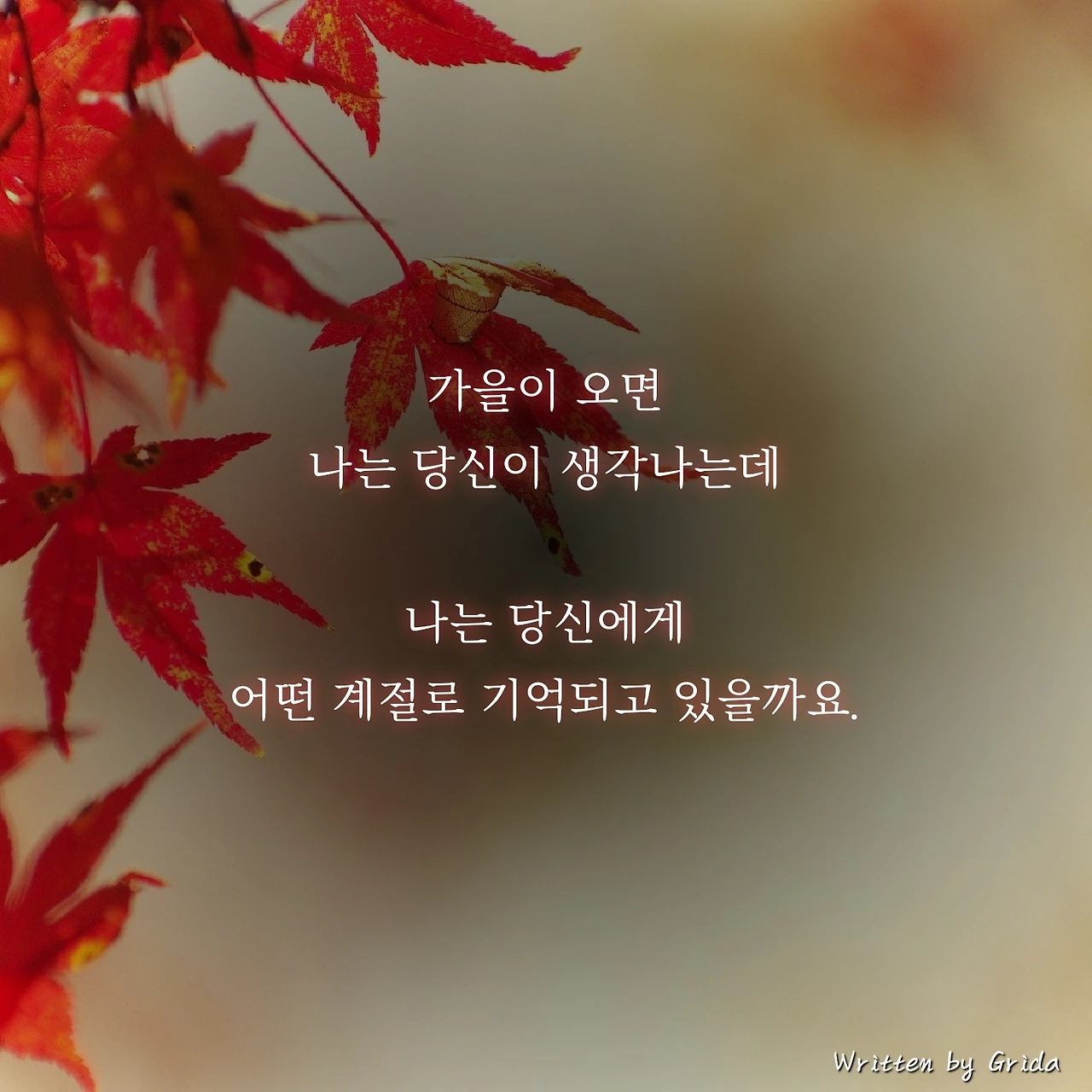 붉어지는 단풍잎을 쳐다만 보아도 가슴이 설레고 마는 이 10월에는 어째선지 나는 가끔 당신이 생각납니다. 당신은 나에게 가을의 붉음으로 남아있는데, 나는 당신에게 어떤 계절로, 또 어떤 온도로 기억되고 있을까요?