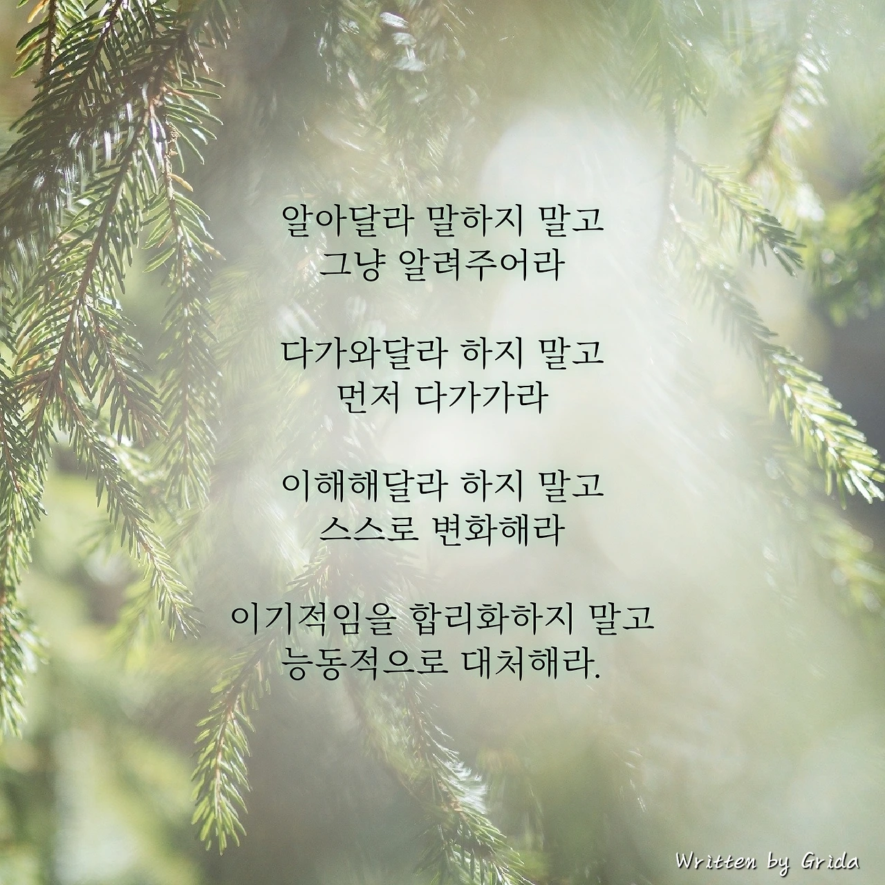 그렇기에 모든 일은 내게서 변화가 있어야 한다. 내 탓이 아니라며 합리화하려는 마음을 매섭게 채찍질할 필요가 있다. 능동적으로 대처하는 습관을 기르게 될 때 우리는 비로소 올바른 의미의 '나'를 깨닫게 된다.
