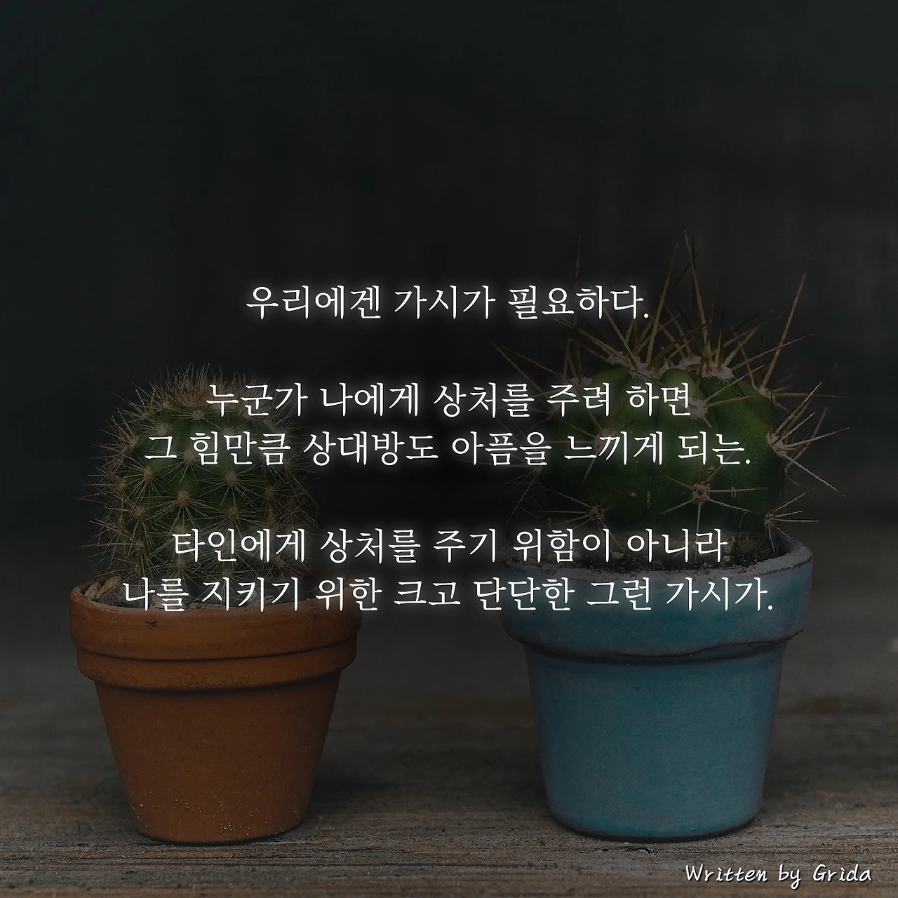 이타심을 가지고 살다 보면 언젠가 거울 앞에 섰을 때 시퍼런 멍 자국이 이곳저곳에 난 내 모습을 볼 수 있다. 타인은 제 생각밖에 하지 않는데 나는 그런 타인을 이해해야 하고, 타인은 나에게 상처를 주지만 나는 그것을 오롯이 감내하는 삶. 나는 그런 삶을 돌이켜보며 가시가 필요하다는 생각이 들었다. 누군가 나에게 상처를 주려 하면 그 힘만큼 상대방도 아픔을 느끼게 되는. 타인에게 상처를 주기 위함이 아니라 나를 지켜내기 위한 크고 단단한 그런 가시 말이다.