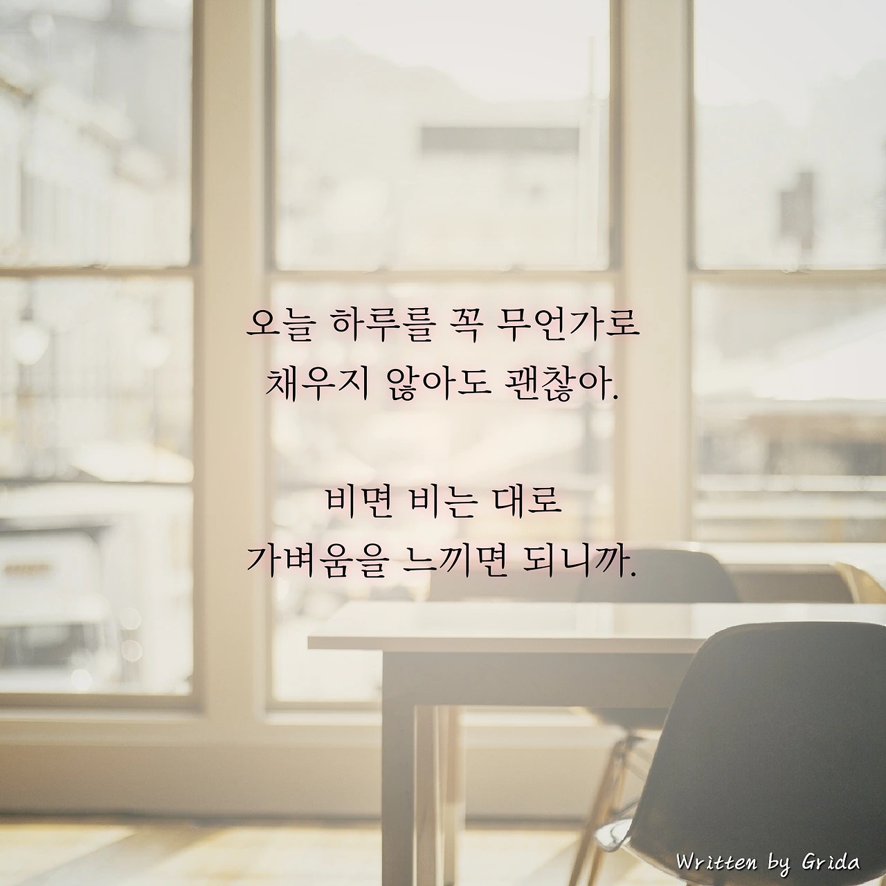 의미를 찾아가는 삶에서 가장 어려운 것은 오늘 하루를 무엇으로 채울까 고민하는 일이다. 그러나 매일 채워가던 시간에 공백이 생기더라도 나는 그리 속상해하지 않는다. 왜냐하면 비면 비는 대로, 부족하면 부족하면 부족한 대로 그 하루는 나에게 가벼움이 무엇인지를 알게 해주니까.