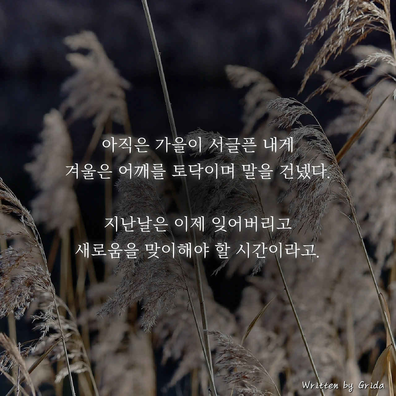 아직은 가을이 서글픈 내게 겨울은 어깨를 토닥이며 말을 건넸다. 지난날은 이제 잊어버리고 새로움을 맞이해야 할 시간이라고.