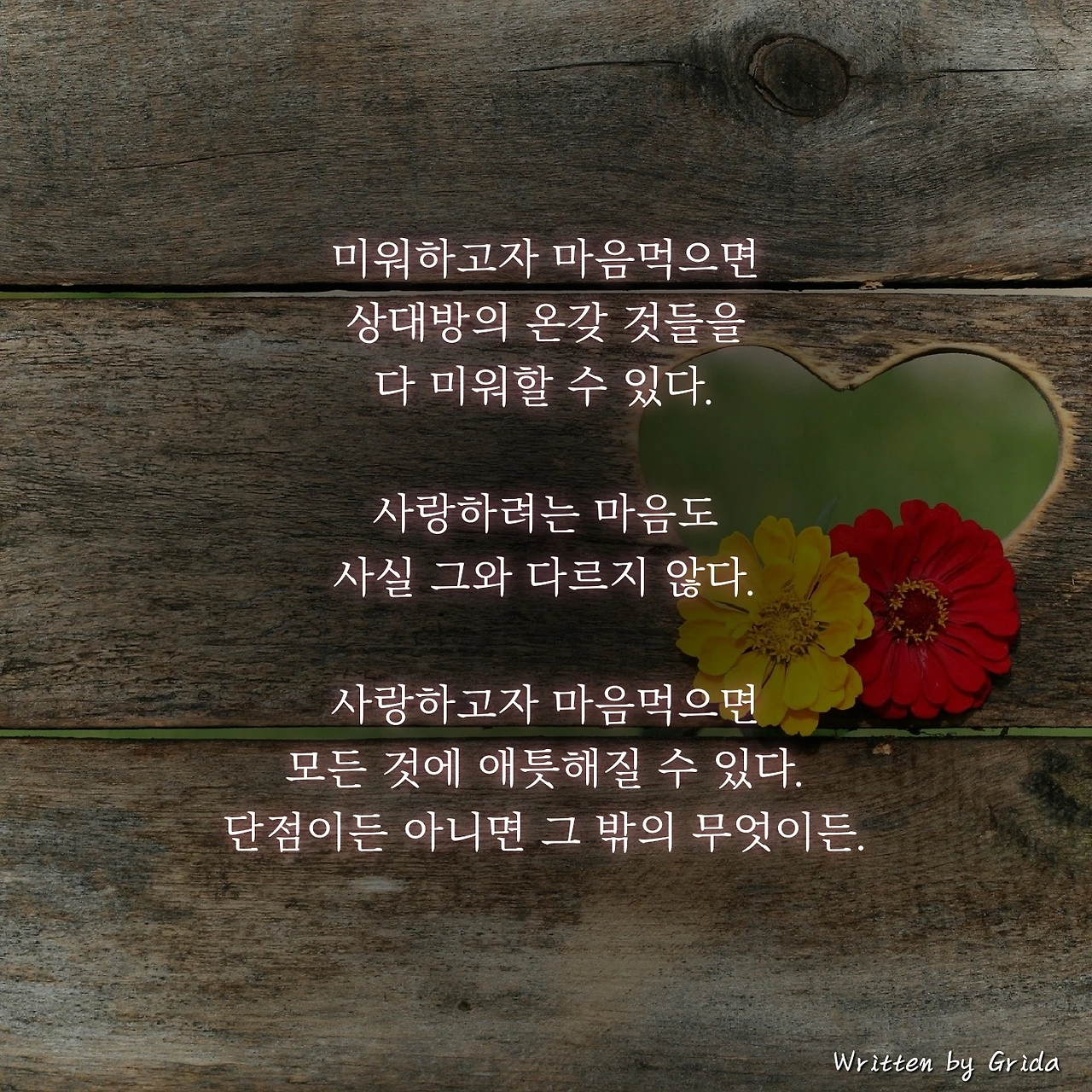 그래서 나는 사랑한다는 마음에 이런 단순함을 끼워보기로 했다. 다른 마음들처럼 사랑도 시작하려는 마음을 먹으면 상대방의 모든 것에 애틋해지는 거라고. 단점이든 아니면 그 밖의 무엇이든 그 사람에게 속한 모든 속성들을 사랑해낼 수 있을 것이라고 말이다.