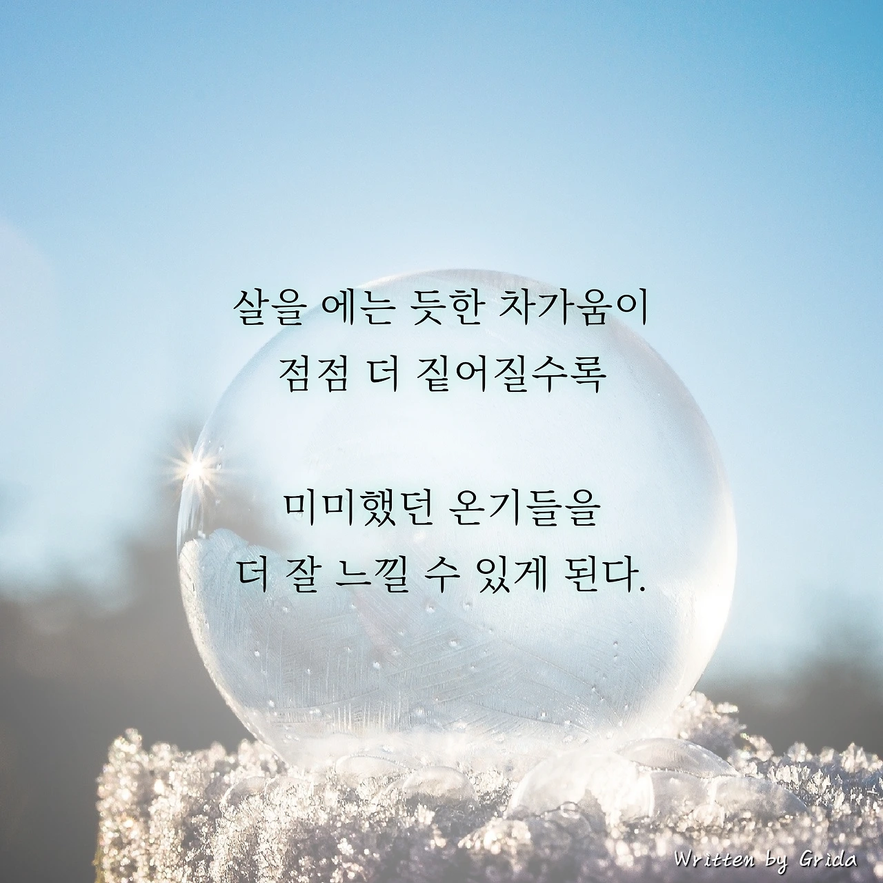 돌이켜 보면 피부로 느끼는 따뜻함처럼 우리의 마음도 차가울수록 온기에 더 민감해진다는 생각이 든다. 마음이 차가우면 그 안에 든 감성 또한 얼어붙을 것이라 생각하기 쉽지만 조금만 신경을 쓰면 오히려 뜨거웠을 때보다 더 섬세하게 따뜻함을 느껴낼 수가 있으니 말이다.