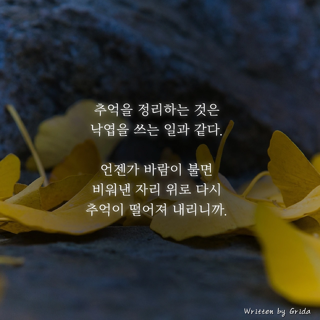 쓸어도 쓸어도 계속 제자리걸음인 낙엽 쓸기를 하던 도중 나는 문득 추억을 정리하는 일이 낙엽을 쓰는 일과 같지 않을까 하는 생각이 들었다. 정리를 했다고 장담하더라도 언젠가 바람이 불면 비워낸 자리 위로 다시 쌓여 가는 것이 추억이었으니까. 나는 낙엽이든 추억이든 쌓이는 것들을 완벽하게 비워낼 수 없다는 것을 알지만, 그럼에도 계속 빗자루를 쥐고 있을 것만 같다. 어쩌면 옥상의 문을 열지 않는 날처럼, 잊는다는 사실조차도 잊게 되는 그런 순간이 오게 될지도 모르니까 말이다.