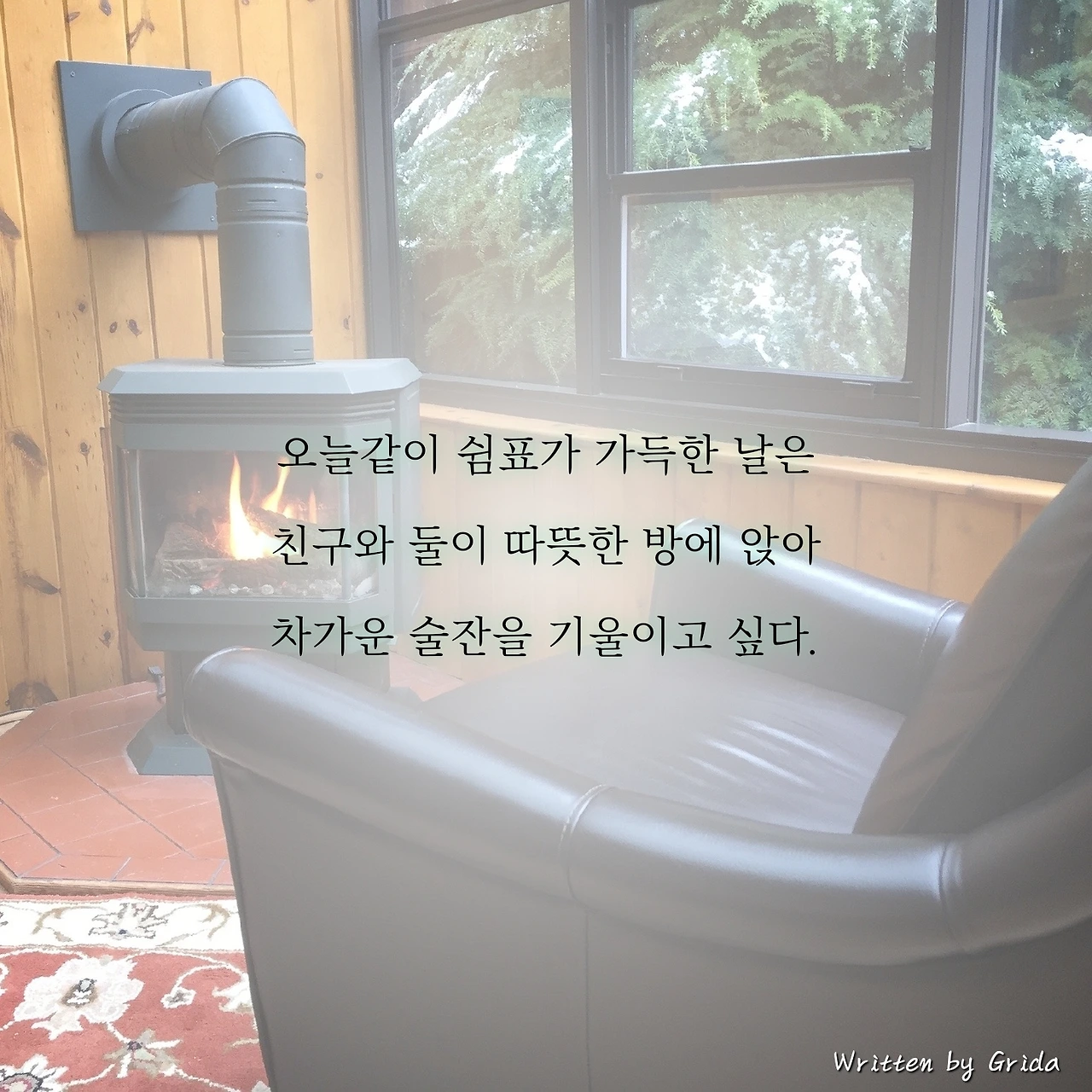 입김을 호호 불며 현관문을 두드리는 친구를 따뜻한 방에 들여 몸을 녹이게 하고, 조촐하게 차린 음식과 술을 내어와 둘이서 작은 행복에 취하고 싶다.