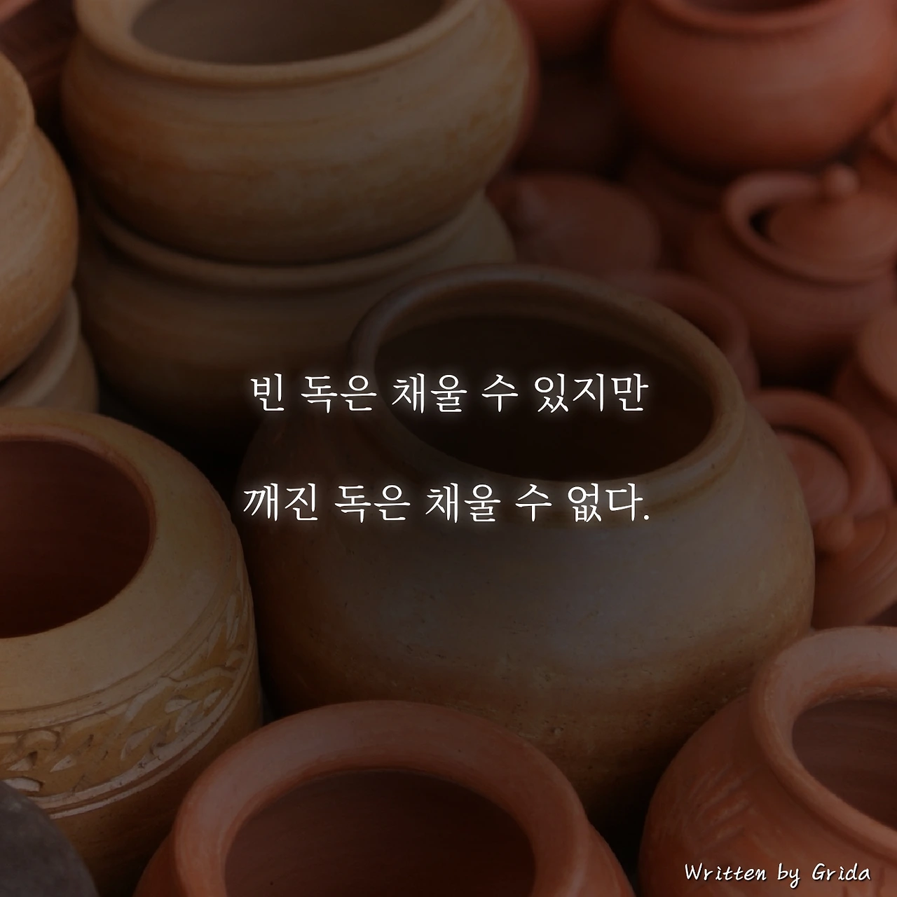 나는 온전한 사람과 그렇지 못한 사람들을 겪어오면서 이런 생각이 들었다. 빈 독은 채울 수 있지만 깨진 독은 채울 수 없다고. 비어 있는 사람은 배려와 노력을 통해 서로가 동등해져 간다는 보람을 느끼게 해주지만 깨진 사람은 자신의 부족한 점을 나열하며 계속 무언가를 요구하기에 나아질 수 없다고 말이다.