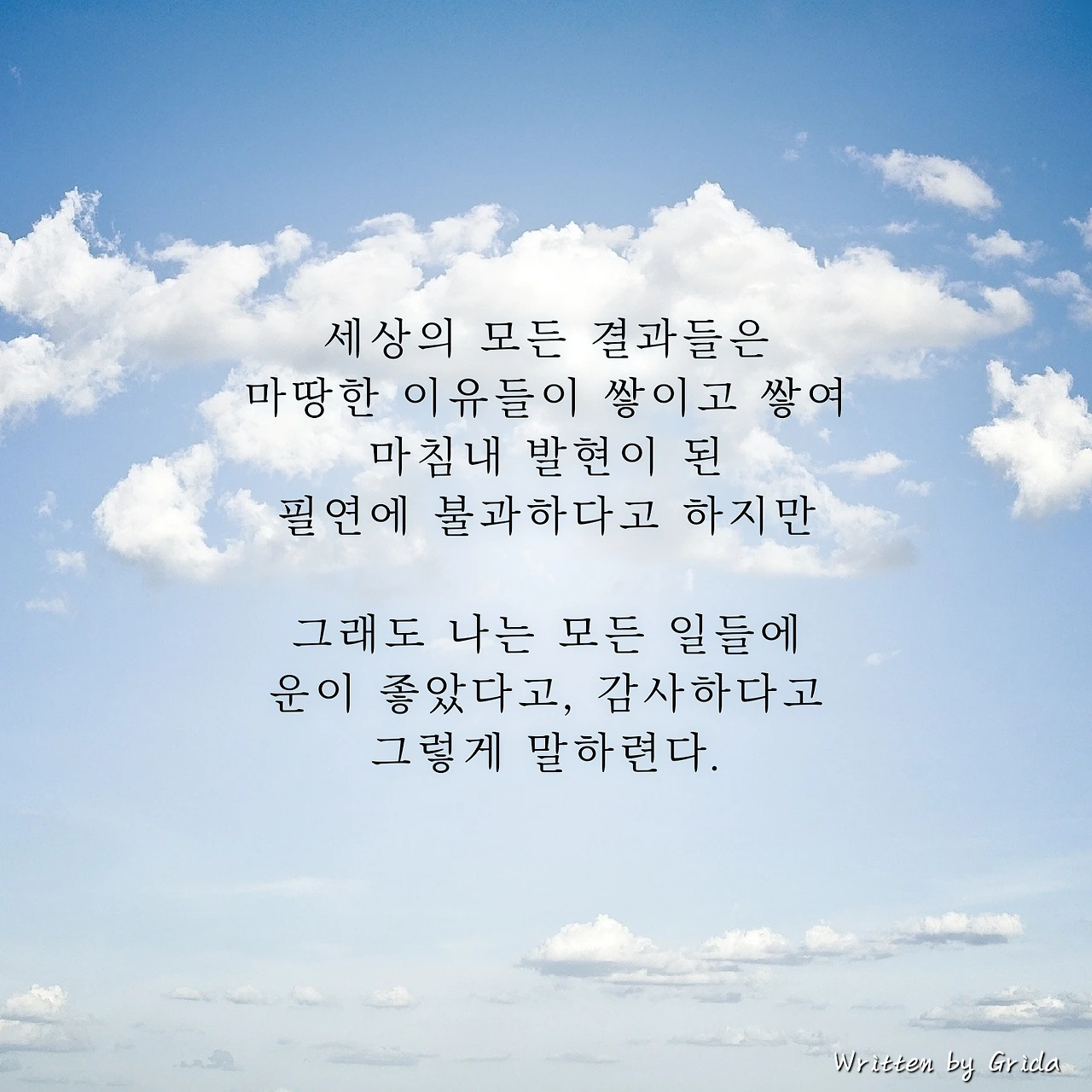 오늘 하루도 내겐 어떤 좋은 일이 생겼다. 내가 바랐던 만큼 노력한 부분도 분명 있었지만 그래도 나는 나를 다잡는다. 그리고 언제나처럼 하늘을 보며 혼잣말을 중얼거려본다. 운이 좋았다고. 그동안의 시간들에 감사하다고.