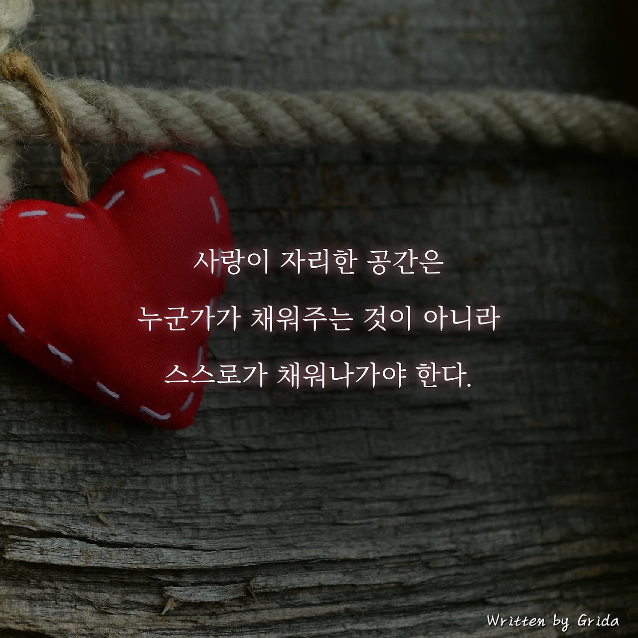 가끔 어떤 사람들은 사랑에 대한 책임을 상대방에게 떠넘기기도 한다. 자신 안에 생겨난 빈 공간을 상대방이 모두 채워주길 바란다. 하지만 내 안에 깃든 사랑은 타인이 간섭할 수가 없다. 마음이란 보이지 않는 영역에 있기에 채우는 것도, 비우는 것도 모두 자신만이 할 수 있다.