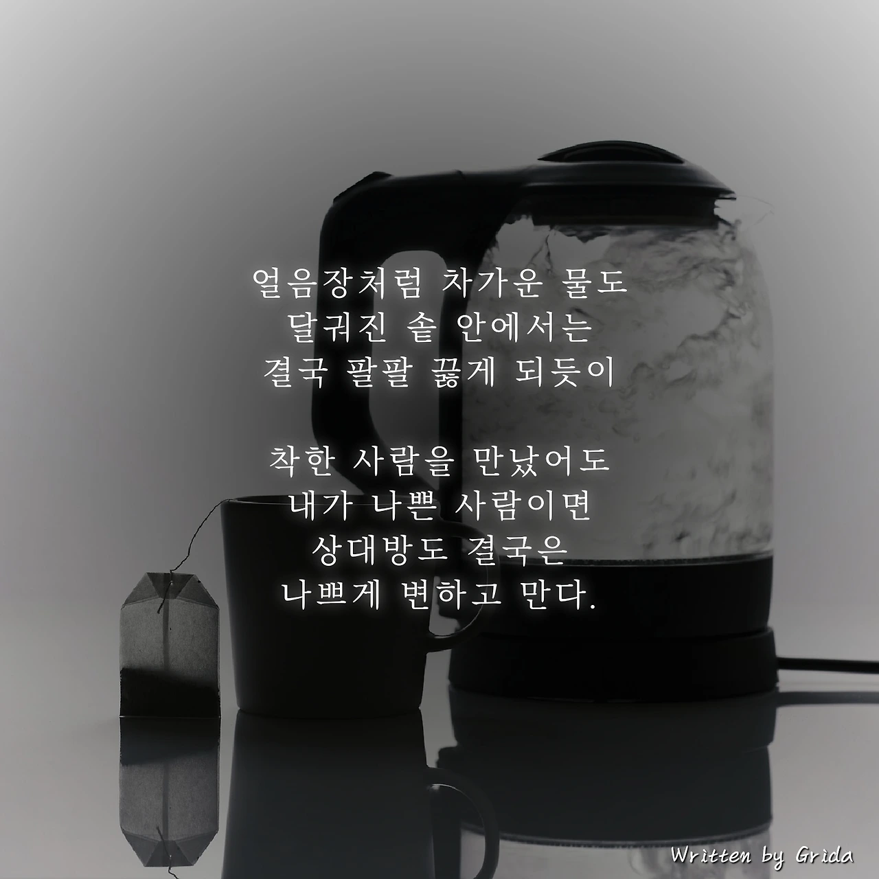 좋은 사람을 만나길 바라는 것도 좋지만 우리는 먼저 좋은 사람이 되어야 한다. 얼음장처럼 차가운 물도 달궈진 솥 안에서는 결국 팔팔 끓게 되듯이, 아무리 착한 사람을 만났을지라도 내가 나쁜 사람이면 결국은 그 사람도 나쁘게 변하고 만다.