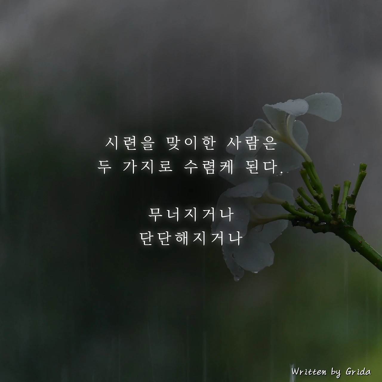 사람은 살아가면서 각자가 선택한 것에 대한 시련을 맞이한다. 그리고 그 시련의 빈도는 나이가 들수록 점점 늘어난다. 주위에서 심심치 않게 볼 수 있듯, 시련을 맞이한 사람은 결국 두 가지 형태로 수렴케 된다. 버티지 못하고 무너지거나, 그것을 씹어 삼키고 단단해지거나.