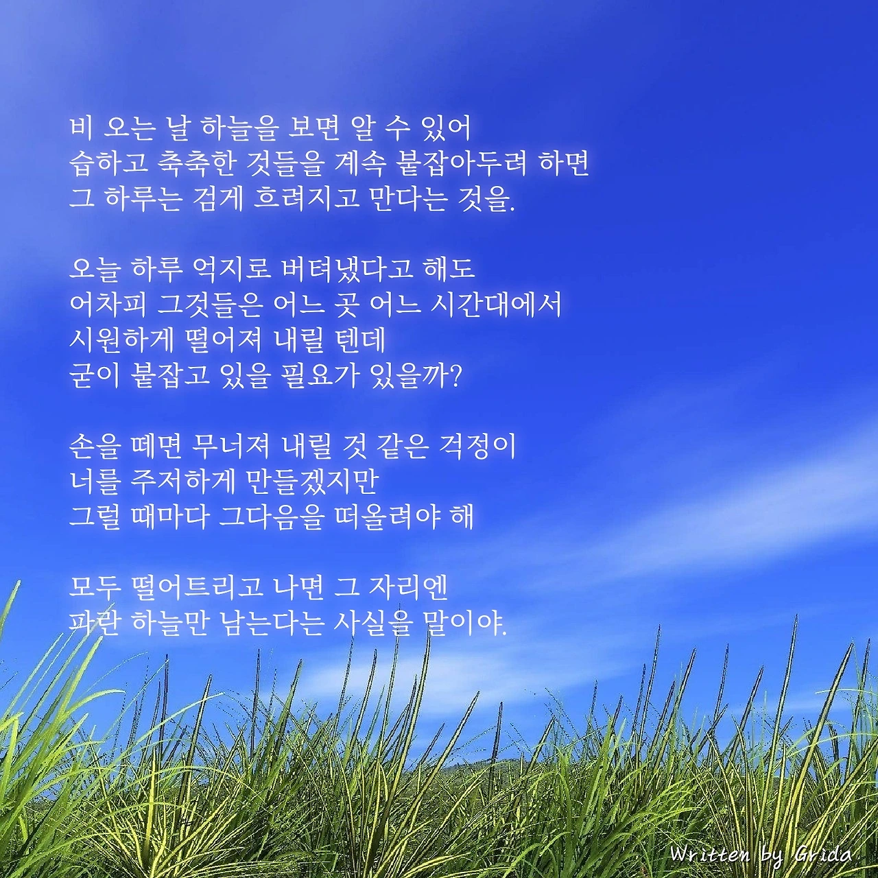 비 오는 날 하늘을 보면 알 수 있어 습하고 축축한 것들을 계속 붙잡아두려 하면 그 하루는 검게 흐려지고 만다는 것을. 오늘 하루 억지로 버텨냈다고 해도 어차피 그것들은 어느 곳, 어느 시간대에서 시원하게 떨어져 내릴 텐데 굳이 붙잡고 있을 필요가 있을까?