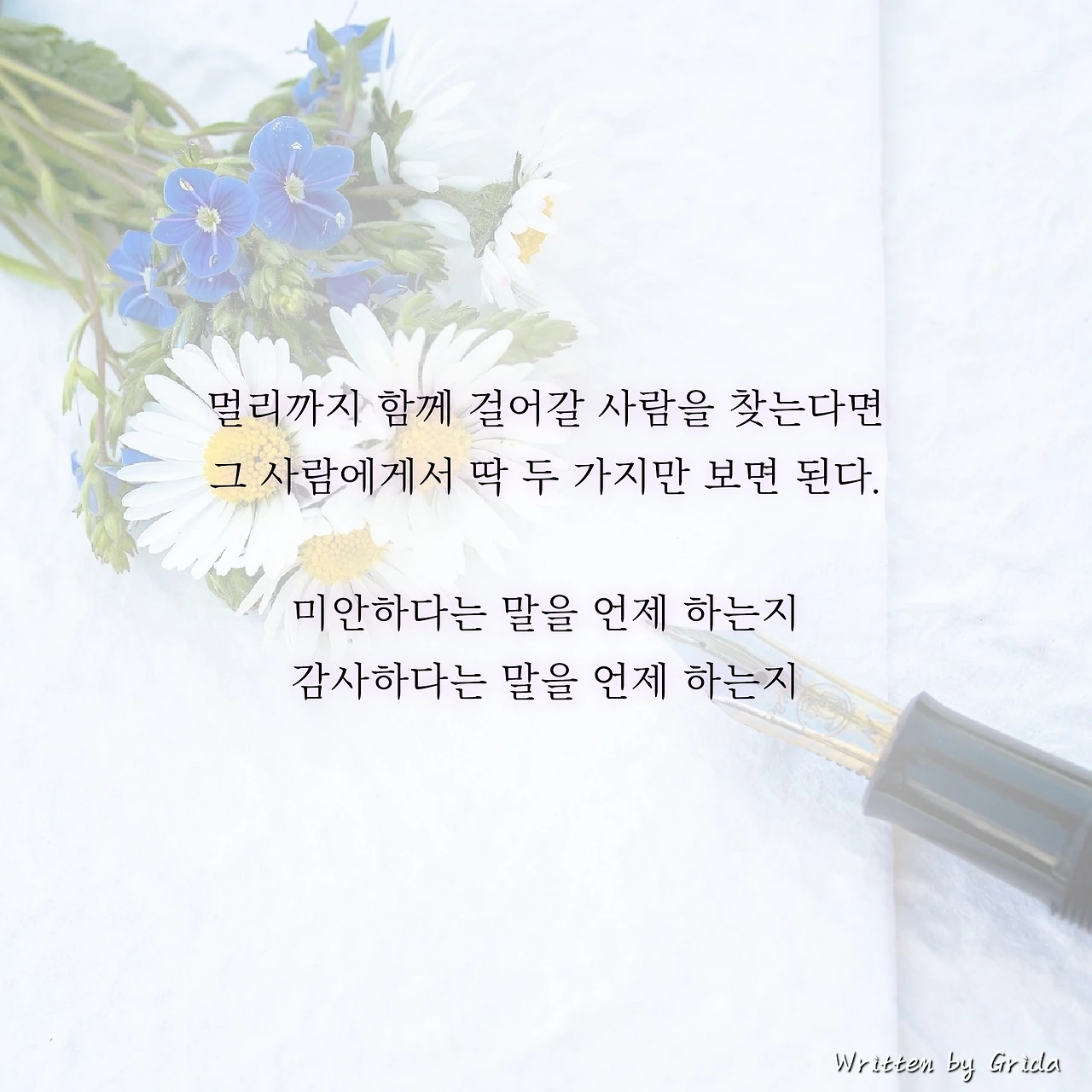 성별을 떠나서 오랜 시간 함께 하고 싶은 사람의 기준은 별반 다르지 않다. 나의 자존감을 채워주고, 잘 공감해 주고, 이해심이 많은 사람이 바로 그것인데, 이런 장점들을 다 지니고 있는 사람은 사실 존재하지 않는다고 봐도 무방하다는 생각이 들었다. 그렇기에 이런 자질구레한 것들을 다 제쳐두고, 오래갈 사람을 찾는 가장 간단한 방법이 무엇이 있을까를 생각해 보니 딱 두 가지 모습이 머릿속에 떠올랐다. 그것은 바로 그 사람이 미안하다는 말과 감사하다는 말을 자연스럽게 할 줄 아는지를 보면 된다는 것.