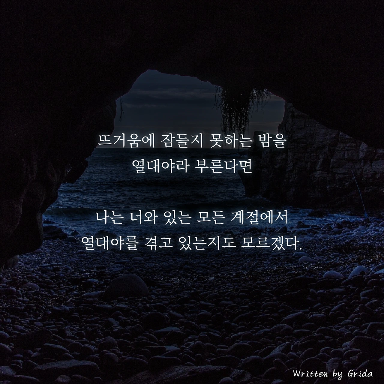 '뜨거움에 잠들지 못하는 밤을 열대야라고 부른다면, 나는 너와 있는 모든 계절에서 열대야를 겪고 있는지도 모르겠다.'라고.