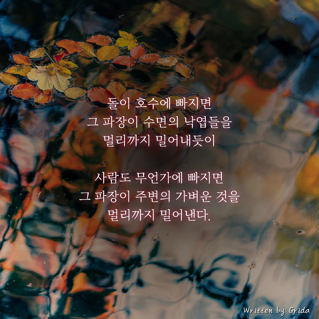 요즘은 매일이 즐겁다. 내가 행복을 느끼는 것들에 집중하고, 사랑하고 싶은 것들을 사랑하니, 안개가 낀 것처럼 산만했던 내 삶이 가을 하늘과 같이 선명해지는 느낌이 든다. 돌이 호수에 빠지면 그때 생긴 파장이 수면의 낙엽들을 멀리까지 밀어내지 않던가? 그처럼 지금 나 역시도 내가 좋아하는 것에 깊이 빠지니, 주변의 자질구레한 것들을 멀리까지 밀어내고 오직 하나만 바라보게 되었다.