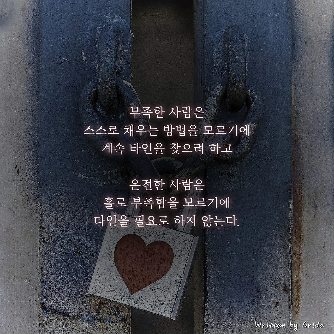 무언가 결핍되고 내면의 성장이 필요한, 소위 '부족한 사람'들은 스스로 채우는 방법을 모르기에 계속 타인을 찾는다. 반대로 만족의 의미를 알고, 자신의 행복을 스스로 찾아낼 줄 아는 '온전한 사람'들은 홀로 있어도 부족함을 모르기에 타인을 찾지 않는다.