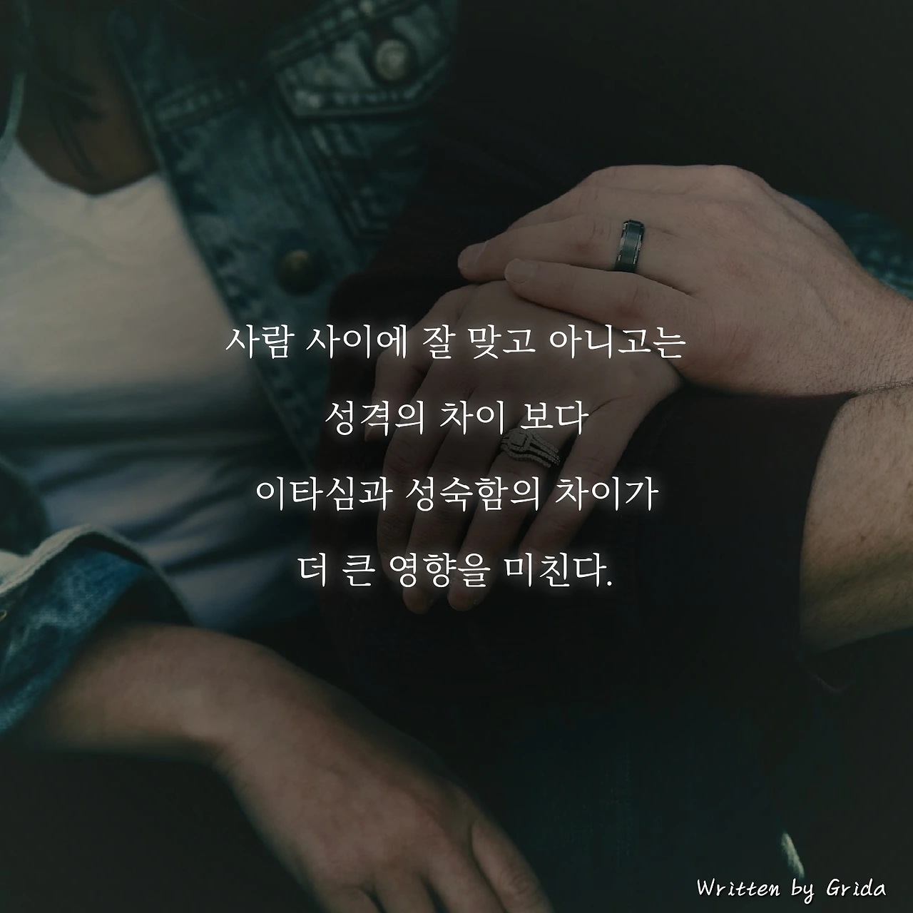 그런데 실제로 주변에서 건전한 연애를 하고, 결혼을 하는 사람들을 보면 그런 기준이나 조언들은 아무런 의미가 없음을 깨닫는다. 겉으로 드러나는 성격은 무척이나 안 맞아도, 상대방의 말을 경청하려 하고, 배려하려는 습관을 지니고 있는 사람끼리는 자연스럽게 서로가 서로의 성격으로 변해갔기 때문이다. 즉, 사람과 사람 사이에 잘 맞고 아니고는 성격의 차이보다 개개인의 이타심과 성숙함이 더 큰 영향을 주는 것이라는 생각이 들었다.