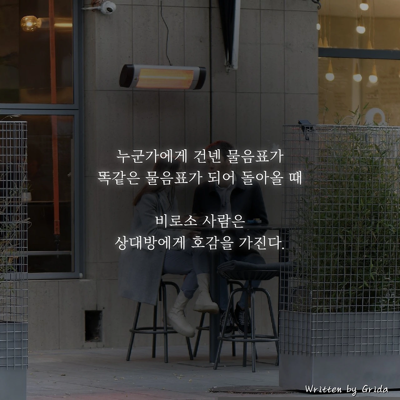 누군가에 대한 관심은 질문이 되고, 질문은 결국 호감이 되어 돌아온다는 것. 즉 내가 건넨 물음표가 똑같은 물음표로 돌아오게 되었을 때, 비로소 사람은 상대방에게 친근함과 호감을 가지게 되는 것 같다.