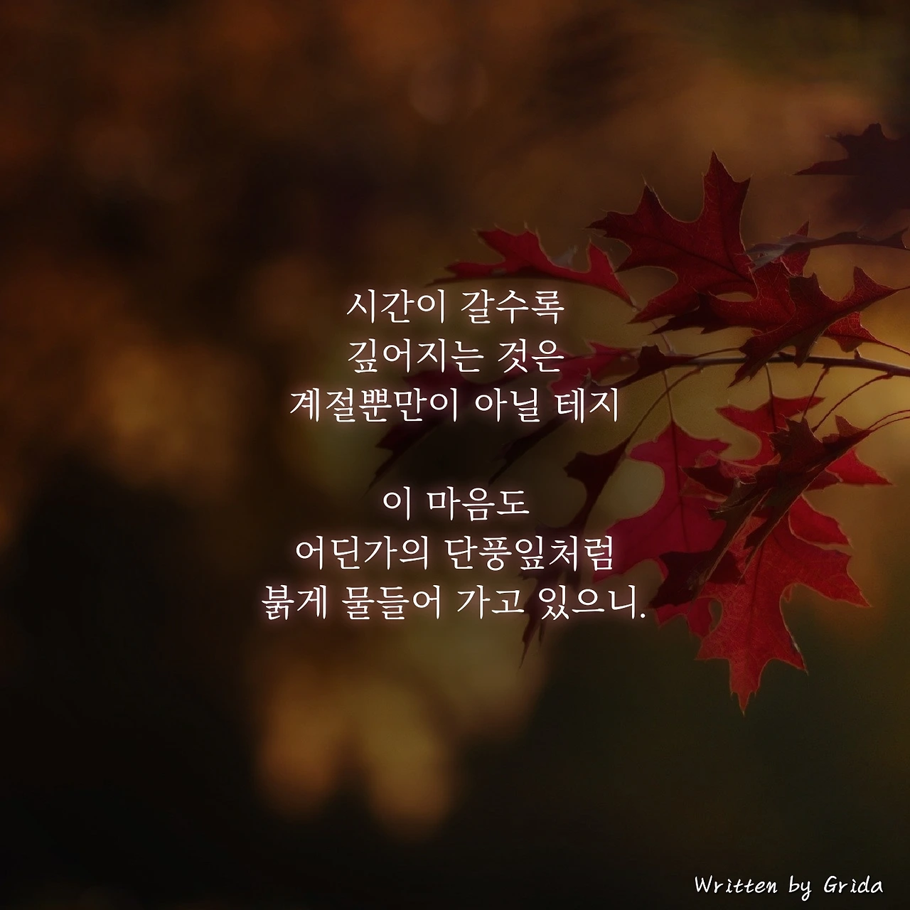 시간이 갈수록 깊어지는 계절. 하지만 짙어지는 것은 비단 이 가을뿐만은 아닐 거라는 생각이 든다. 이 마음도 어딘가의 단풍잎처럼 붉게 물들어 가고 있으니