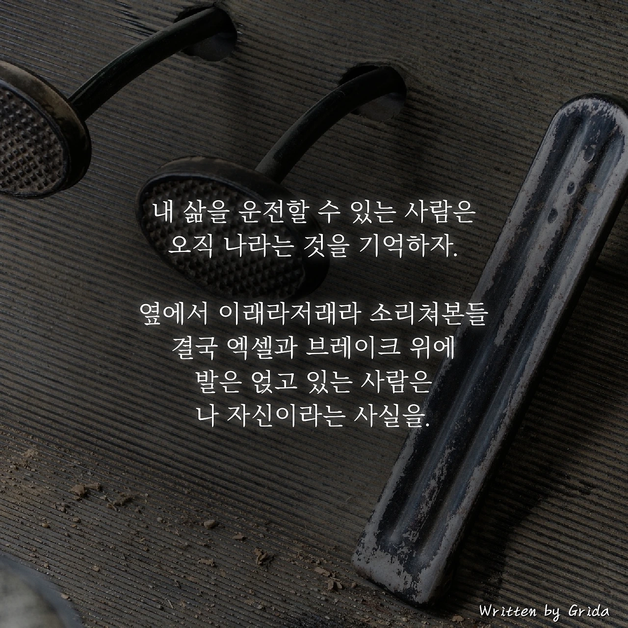 때로는 타인에 의해서 내 삶이 변할 것 같다는 공포가 생길 수도 있지만, 내 삶을 운전할 수 있는 사람은 오직 나라는 것을 기억하자. 옆에서 이래라저래라 소리쳐본들 결국 엑셀과 브레이크 위에 발은 얹고 있는 사람은 나 자신이라는 사실을.