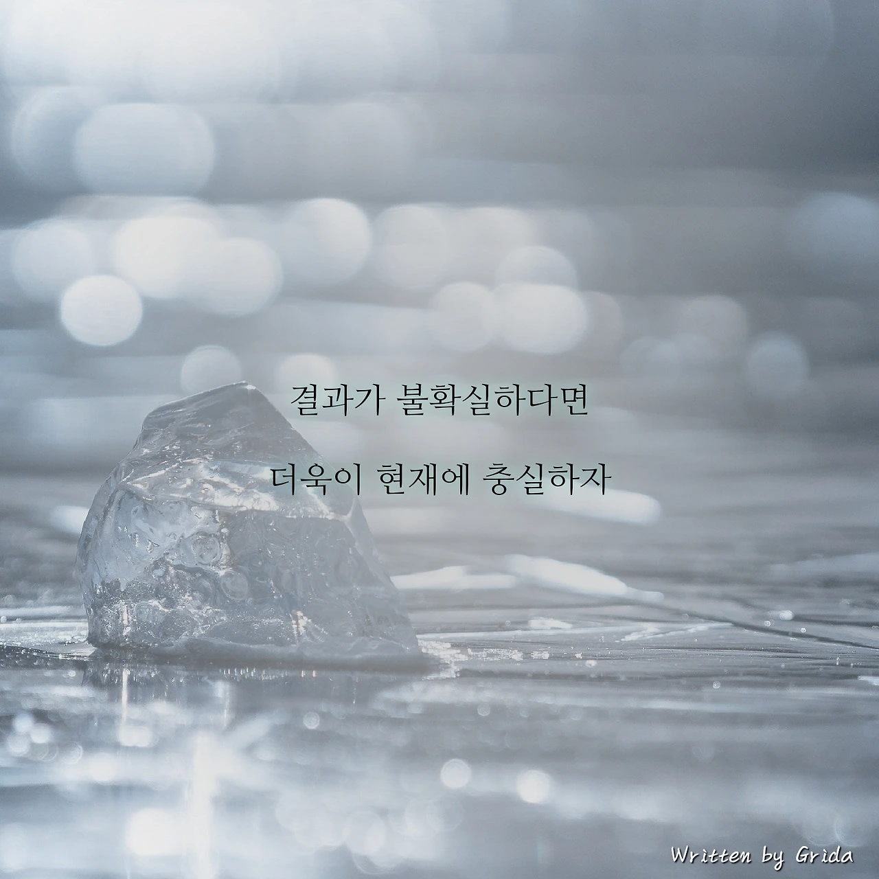 바라는 결과는 있지만 이루어질 수 있을지 알 수 없는 불확실한 미래. 그런 상황을 맞이할 때면 나는 현재에 더 충실하려고 노력한다. 어떤 결과가 있든지 겸허히 수용하겠다는 마음을 가지자고. 결과에 대한 부담을 내려놓고 지금 이 순간 내가 할 수 있는 최선을, 그리고 진심을 다하자고.