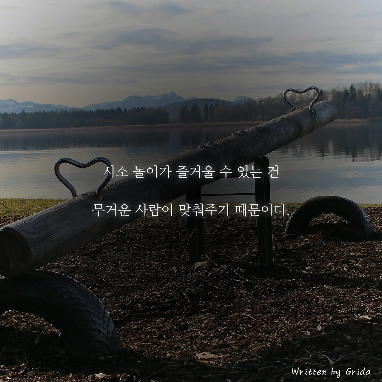 나는 이 모습을 보면서 문득, 시소와 닮아있는 사람 사이의 관계를 떠올렸다. 내가 지금 누군가와의 관계에서 행복하다면, 나보다 더 짙고 무거운 마음을 가진 상대방이 나에게 맞춰주고 있는 것은 아닐까 하는 생각을.