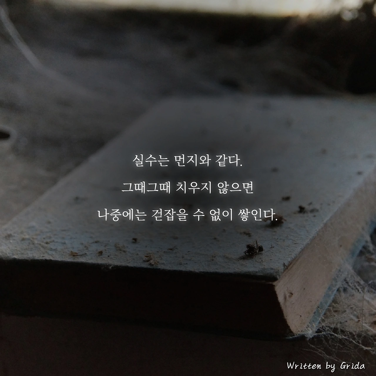 매일 청소를 할 때면 생각나는 것이 있다. 먼지든 쓰레기든 그때그때 정리하고 치우지 않으면 나중에는 걷잡을 수 없이 쌓여 더 나를 골치 아프게 한다는 것. 그리고 우리가 일상을 살아가면서 저지르게 되는 실수나 잘못들도 이런 먼지와 그리 다르지 않은 속성을 지녔다는 것을.