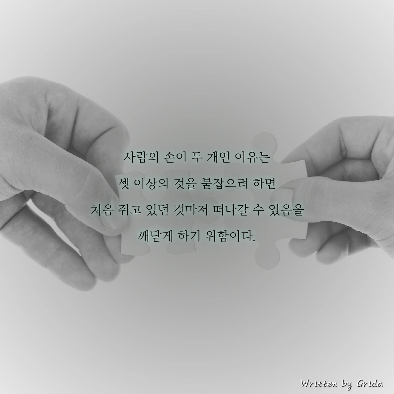 그래서 나는 소유하고자 하는 욕심이 떠오를 때마다 항상 나의 손을 바라본다. 나의 손이 두 개만 존재하는 이유를. 괜한 욕심에 많은 것을 붙잡으려 하면 처음 쥐고 있던 것마저 떠나갈 수 있다는 그 사실을.