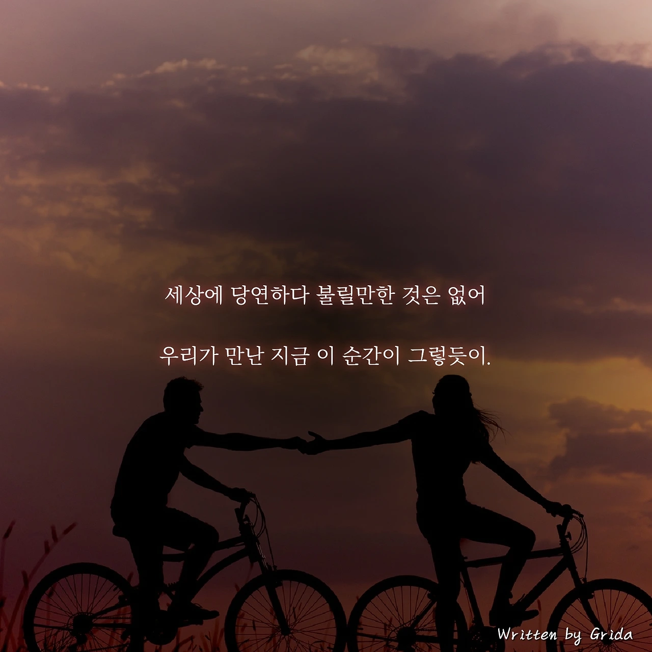 그러니 매일 소소한 순간. 작은 것 하나에 감사하자. 꼭 주고받는 것이 아니더라도, 서로가 서로의 옆에 있음에 감사하자. 그리고 평범함과 지루함이라는 말에 혹해서 가벼워지지 말자. 순간을 소중하게 바라볼수록 우리는 서로에게 기적과 같은 존재들이라는 걸 조금씩 깨닫게 될 테니.