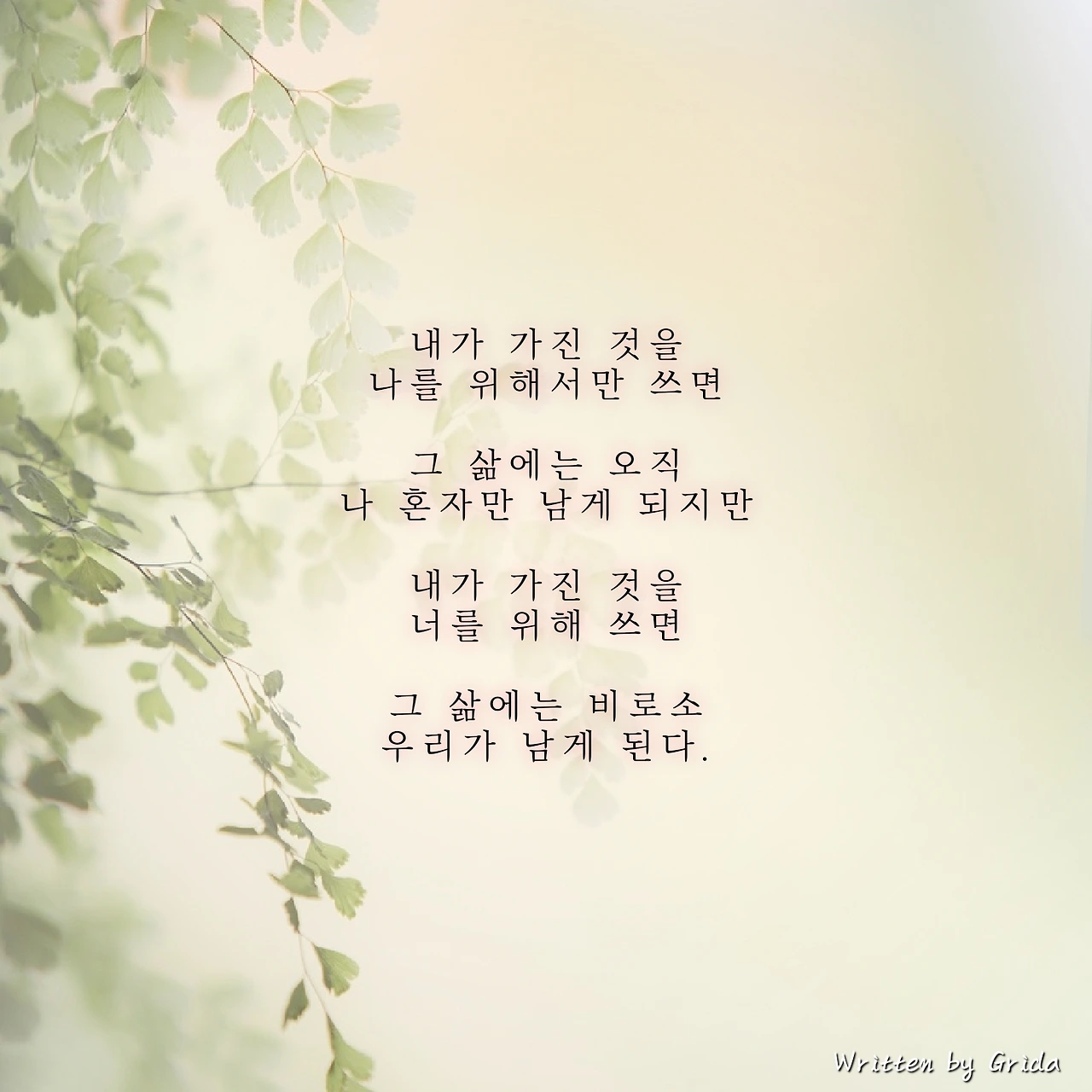 시간이든 물질이든 나를 위해서 그것들을 쓰는 행위는 무척이나 행복한 일이지만, 그것이 항상 좋은 일만은 아니라는 것을 주변을 보며 느낀다. 내가 가진 것을 나를 위해서만 쓰면 그 삶에는 오직 나 혼자만 남게 되지만, 내가 가진 것을 소중한 사람을 위해 나눌 줄 알면 그 삶에는 비로소 우리라는 이름이 채워지게 된다는 것을.