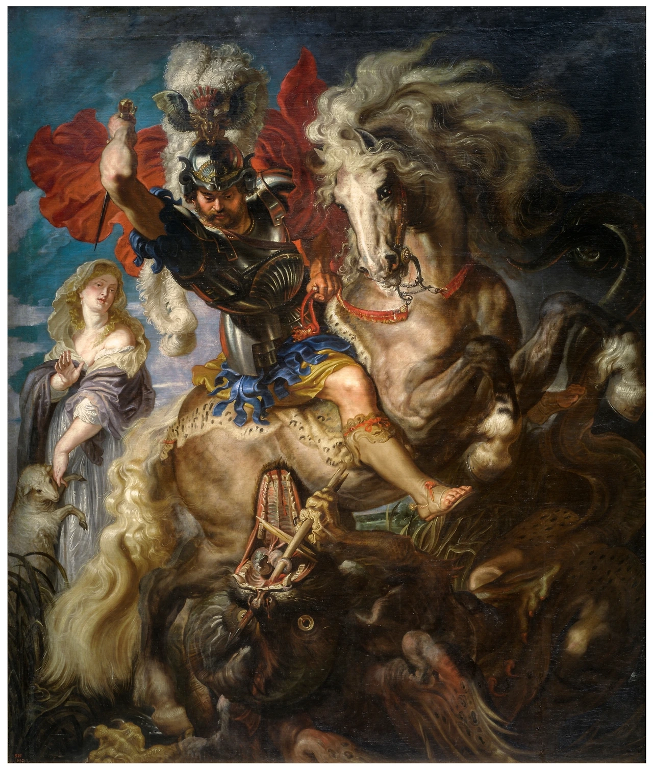라파엘로의 영웅 호르헤를 검색해서 이 루벤스의 영웅 호르헤와 같이 본다면 놀랄 것이다. 라파엘로의 그림이 이렇단 말인가? 하고 충격 속에 빠져들게 만든다. 마치 라파엘로의 그림은 한 편의 만화의 한 컷을 보는 듯한 느낌이 밀려오고 루벤스의 그림은 역동적이면서 살아 움직이는 듯 느껴지기 때문이다. 특히 호르헤에게서 느껴지는 강한 근육의 모습은 루벤스가 늘 자신의 작품 초기에 반영했던 미켈란젤로의 영향력이 강하다. 그리고 무엇보다 과학적인 선의 구조로 그림을 더욱 역동적으로 몰아치고 있는 것을 보게 된다. 바로 대각선 구도이다. 말이 왼편 아래에서 오른편 위로 대각선 구도를 유지하면서 특히 머리가 다시 아래쪽을 내려다보는 그 상황 속에서 역동 미의 최고 절정을 표현하고 있다. 이러한 감각은 레오나르도 다빈치의 과학적 인체구조에 따른 것이다.