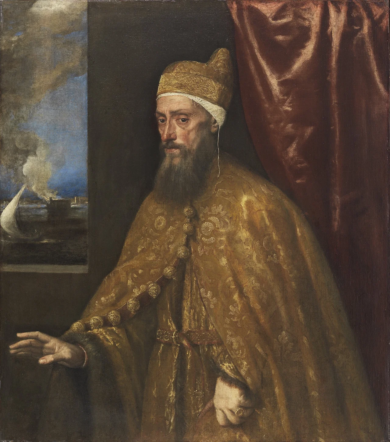 이 그림의 주인공은 베니치아를 2년간 다스렸던 프란체스코 베니어를 그린 초상화이다. 화재로 인해 소실된 안타까움도 있지만, 이 작품이 전해주는 통치자의 면모를 보게 됩니다. 사뭇 군주들의 화가다운 터치가 느껴지는 화풍이다. 하지만 일반 군주들과는 달리 개인적인 이미지를 최대한 살리려 한 작품의 구성을 느끼게 된다. 창문 뒤에는 베네치아 강가 항만에 불이 붙어 있는 것을 그렸다. 직물적인 특성을 희생하지 않고 화려함으로 멋진 초상화를 만들었지만, 티치아노의 위대함은 이 사람이 무엇을 했었는지 그리고 그 시기에 무슨 일이 일어났었는지를 화폭에 담아 보고 느끼도록 해 준다는 것이다.