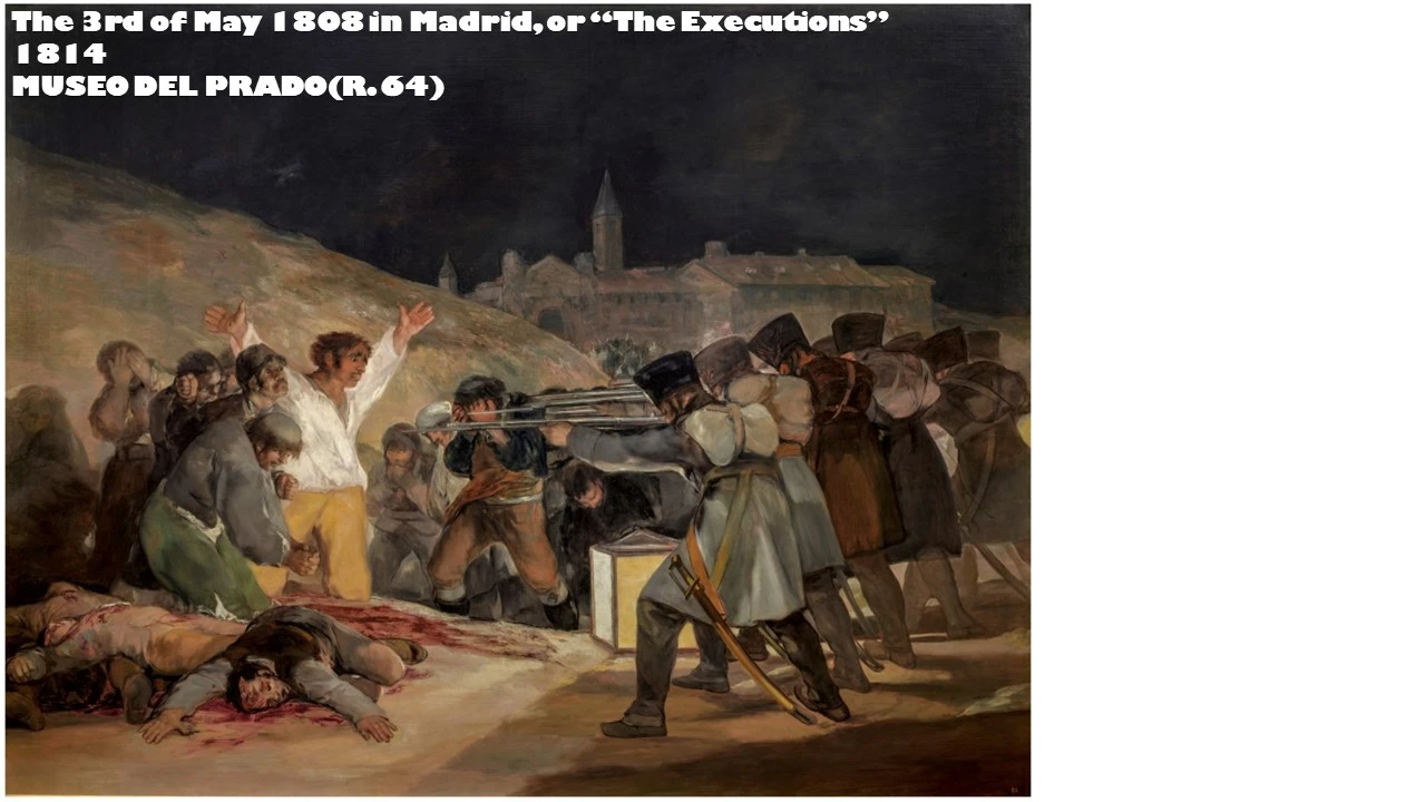 or “The Fight against the Mamelukes”. 1814. MUSEO DEL PRADO. R.64)과 5월 3일(The 3rd of May 1808 in Madrid, or “The Executions”. 1814. MUSEO DEL PRADO. R.64)의 그림을 통해서 전쟁의 잔혹성과 그것을 통한 우울함과 낙심의 한계점을 지적하고 그것을 막아보고자 하는 열망은 결국 세상을 움직이는 그림이 되었다. 피카소를 통해 1808년 5월 3일은 리메이크 되어 한국에서의 학살(Pablo Picasso. Vallauris, 18 janvier 1951. Musée national Picasso)을 통해 당시 중국과 일본만 알던 아시아에 작은 한국이라는 나라가 있음을 깨닫게 해 주었고, 그로 인해 한국전쟁의 해결에 대한 모티브를 제공한 것도 이 그림이 발단이 되었음을 우리는 인지하고 있다.